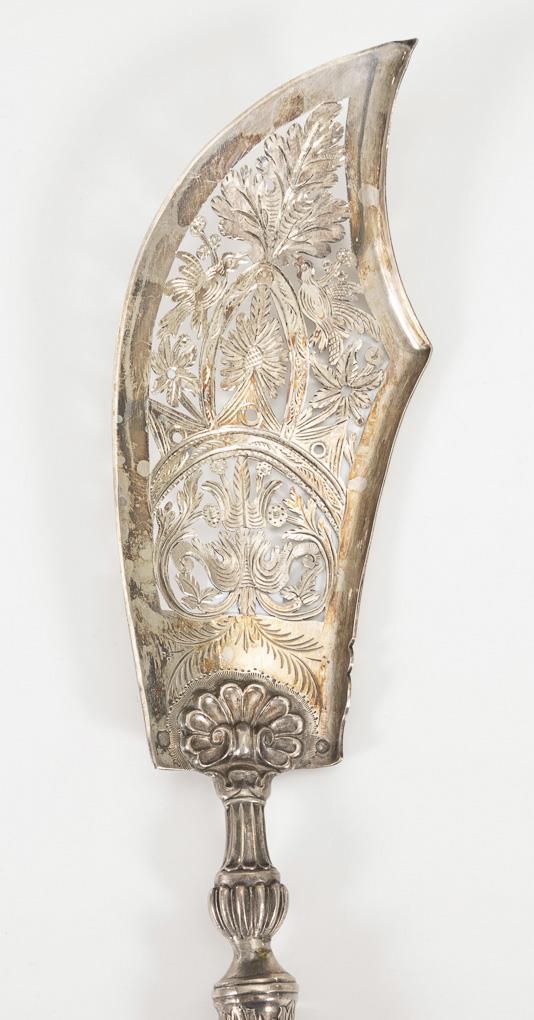 Floral durchbrochener Silberheber mit Holzgriff. Griff leicht gelockert.