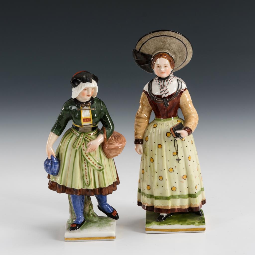 1x Frau in schwäbischer Tracht (aus der Serie "Bayerische Volkstypen", Entwurf Josef Anton Grobmer). / 1x Frau in Dachauer Tracht (Entwurf Maier) mit Nusssäckchen und Korb.