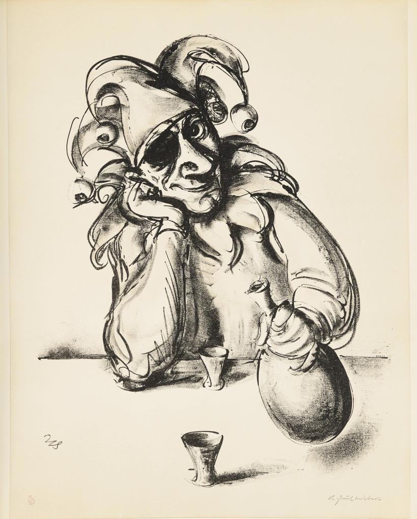 Nach einem Holzschnitt der 1920er Jahre, einer Federzeichnung für das Titelblatt eines geplanten, aber nicht gedruckten Eulenspiegel-Buches sowie einer Kreidelithografie für die Neufassung der Illustrationen desselben Projektes, das Motiv befindet sich ebenso als Ölbild in Privatbesitz. Blatt beschnitten, oberer Rand etwas lichtgebräunt, Ecke unten rechts etwas bestoßen.