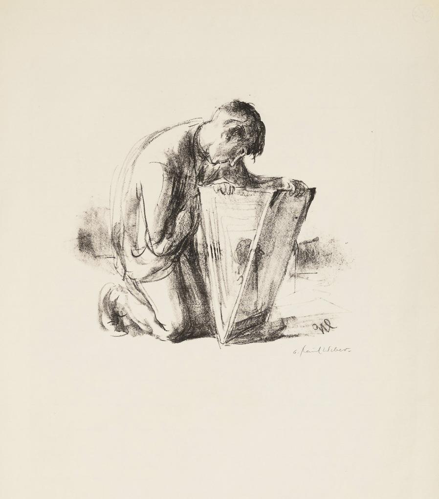 Das Motiv wurde als Signet der Griffelkunst-Vereinigung Hamburg für Postkarten, Briefpapier, Stempel und Wasserzeichen verwendet. Randbereich leicht griffspurig.