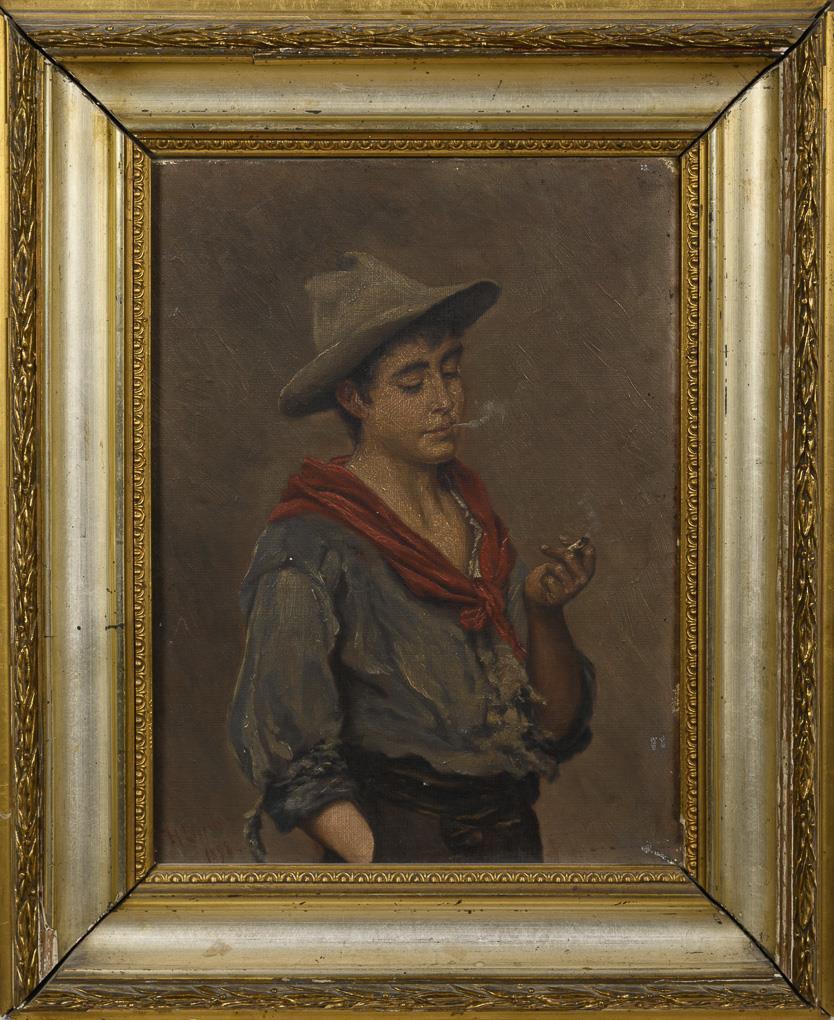 Ärmlich gekleideter Junge mit Zigarette vor neutralem Hintergrund. Altersspuren.