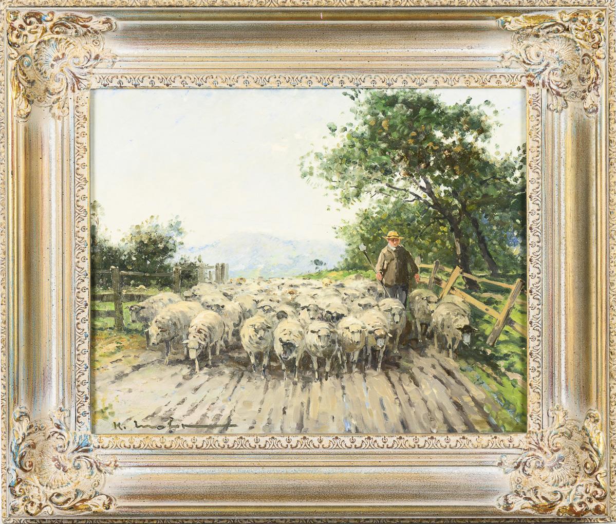 Der Hirte mit den Tieren auf einer Straße in bergiger Landschaft.
