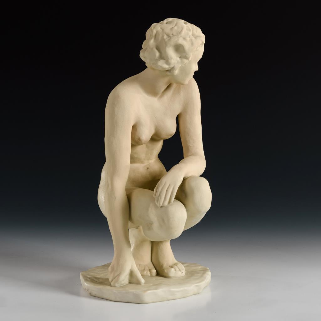 Sich mit einer Hand abstützender, hockender Frauenakt.