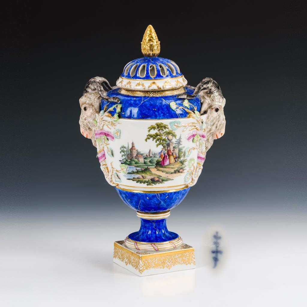 Ovoider Korpus mit 2 Widderköpfen, durchbrochenem Deckel, Rundfuß, auf Quadratplinthe. Blauer Teilfond, beidseitig eine Landschaft mit Figurenstaffage. Einige Blätter bestoßen.