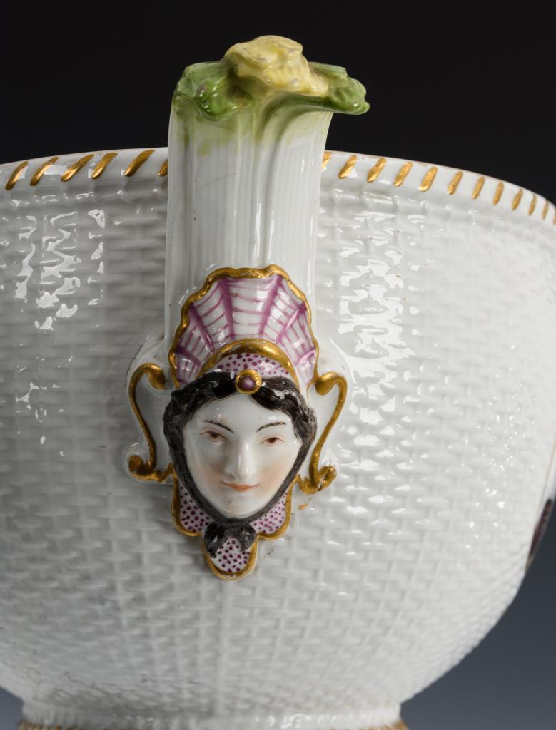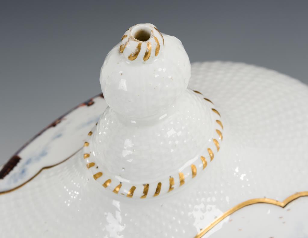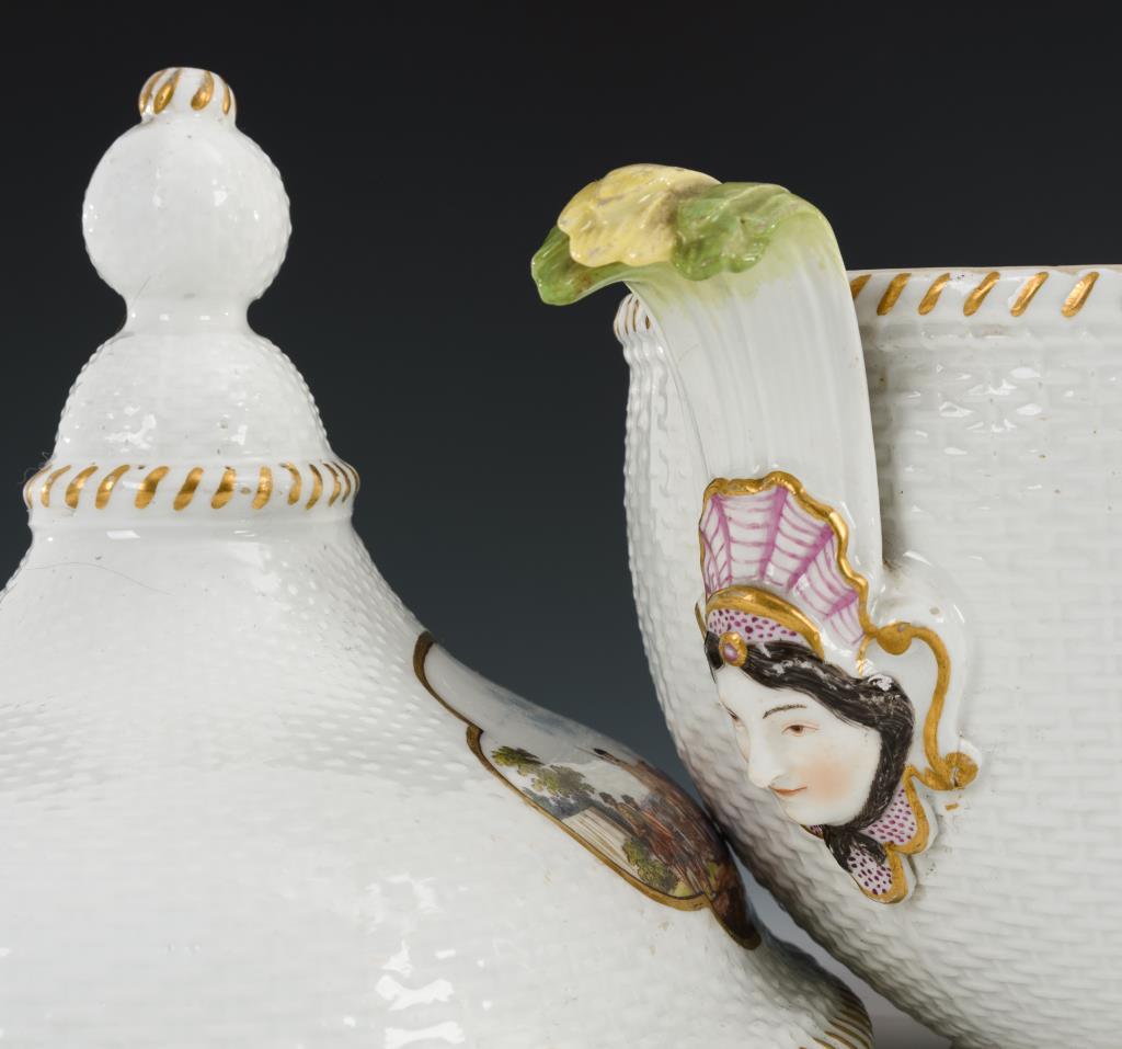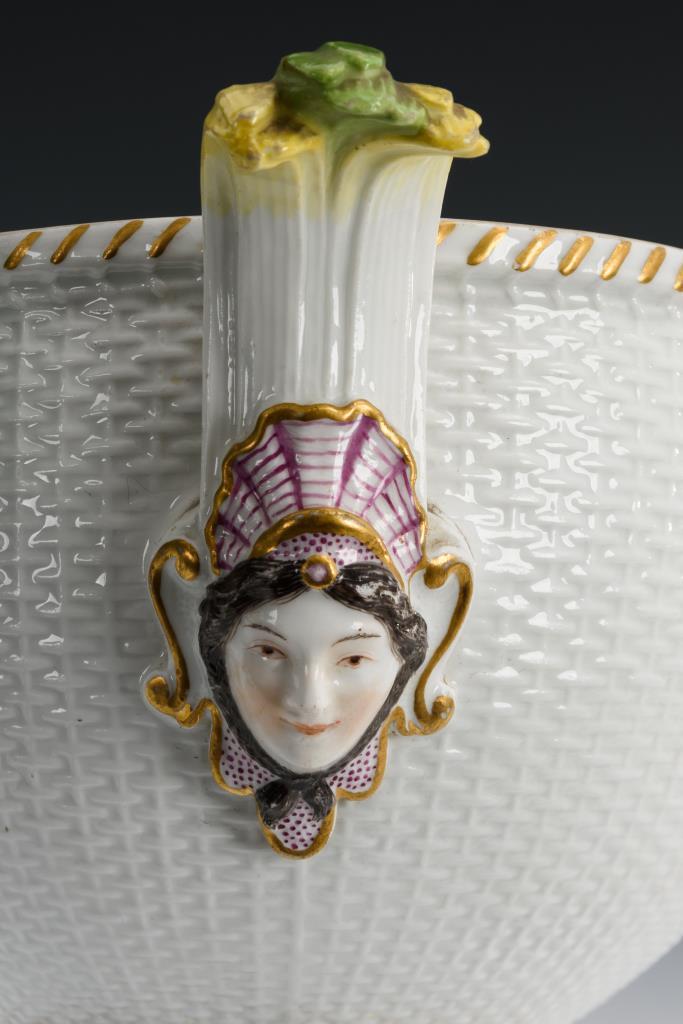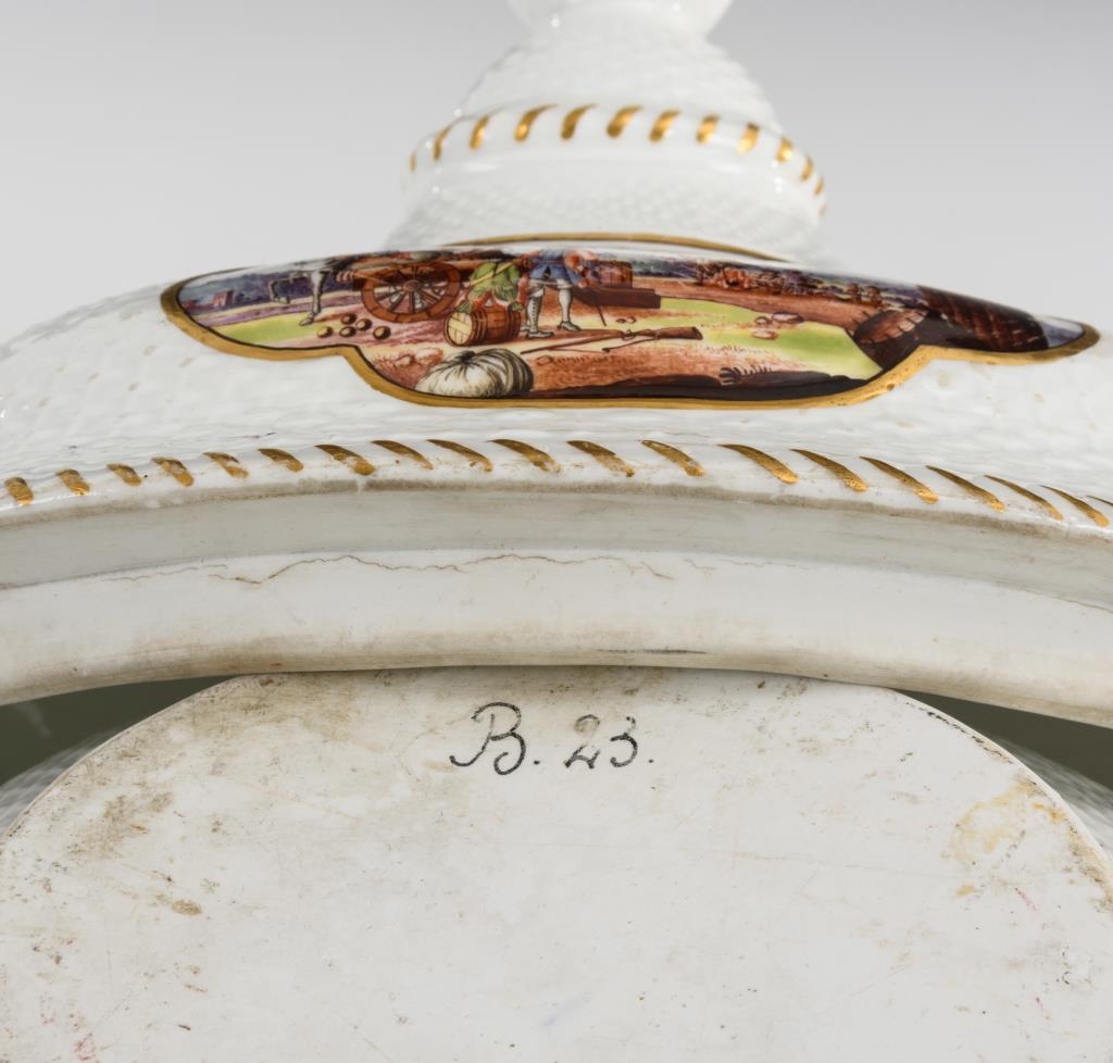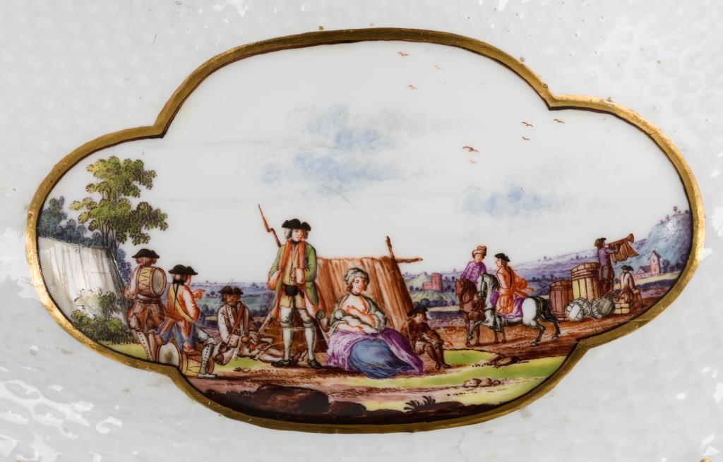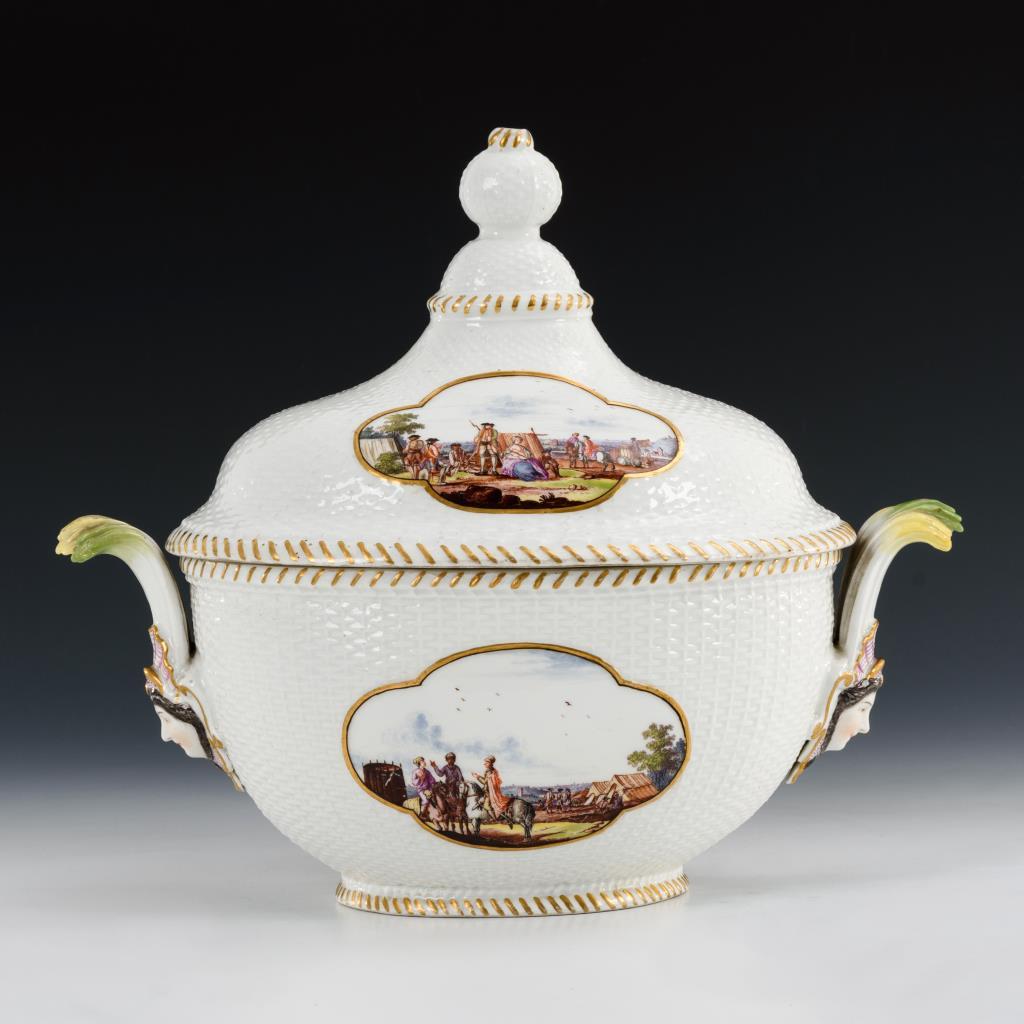 Ovale Terrine mit Korbstruktur, zwei Maskaronhandhaben und Knaufdeckel. In vier Vierpasskartuschen verschiedene Szenen aus einem Militärlager. Partieller Goldabrieb, partiell Kratzspuren auf der Malerei, kleiner Brandriss an 1 Handhabe sowie 3 kleine Brandriss im Spiegel, Handhaben minimal berieben.