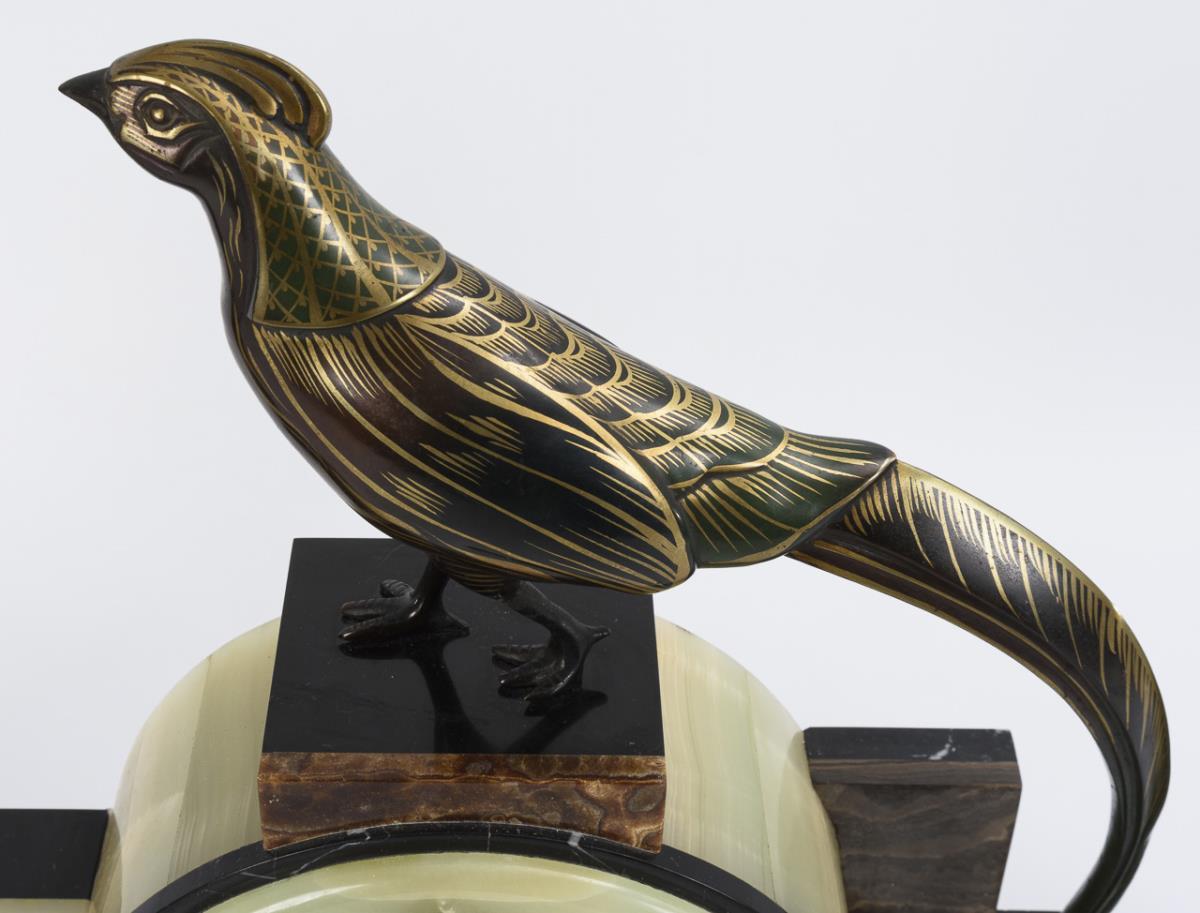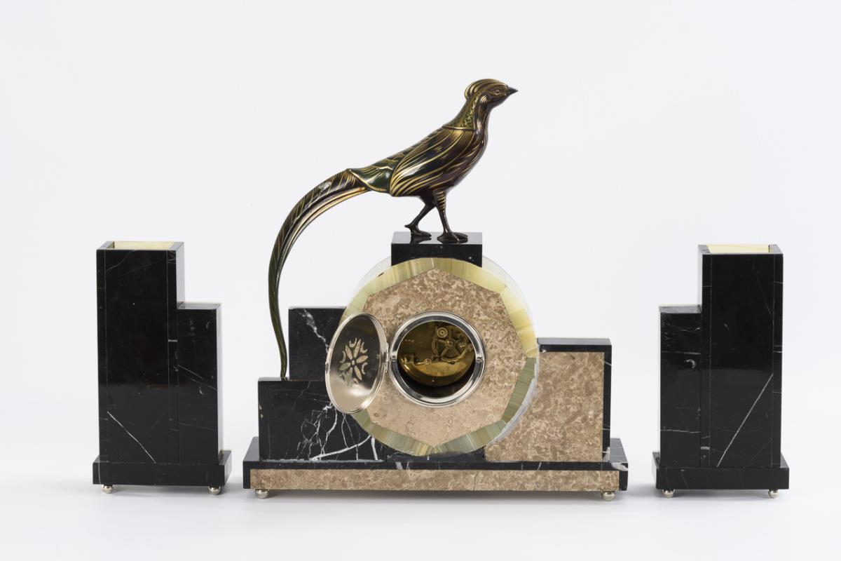 Verschiedenfarbiger Marmor, staffierte Bronze. Uhr ca. 44,5 x 40 x 11,5 cm, Beisteller H 26,5 cm. Gesamt 22,1 kg.
