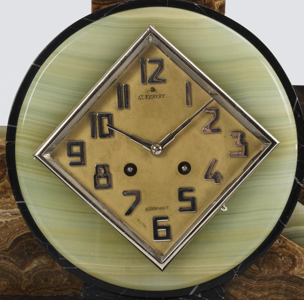 Ungemarktes Werk mit Halbstundenschlag auf (fehlender) Glocke, revisionsbedürftig. Verglastes Metallzifferblatt mit arabischen Zahlen und modernen Zeigern, bezeichnet "G. Vervey, Wormhout".