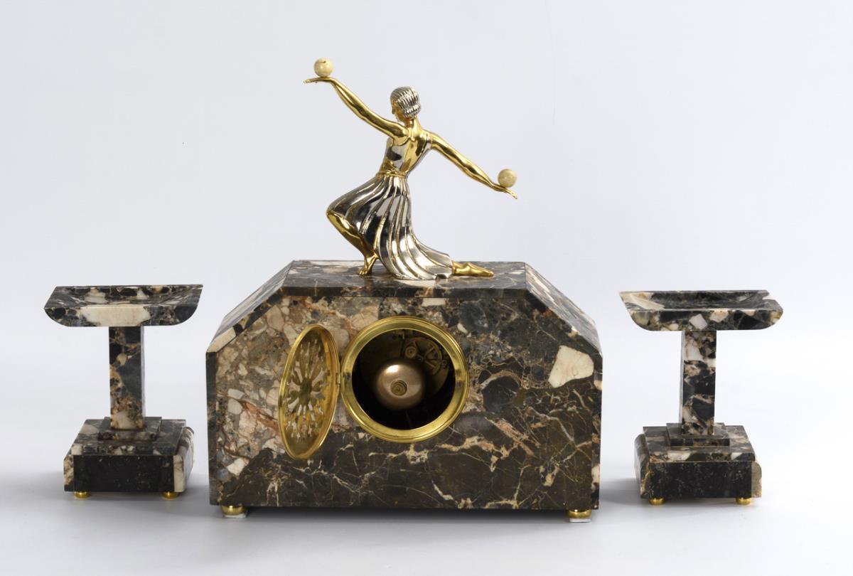 Geometrisiertes Gehäuse mit geschrägten Seiten und einer bekrönenden Tänzerin mit 2 Kugeln. Dazu 2 passende Beisteller in Form von kleinen Tafelaufsätzen. Verwendung alter und neuer Teile, leichte Kantendefekte und Bereibungen am Zifferblatt.