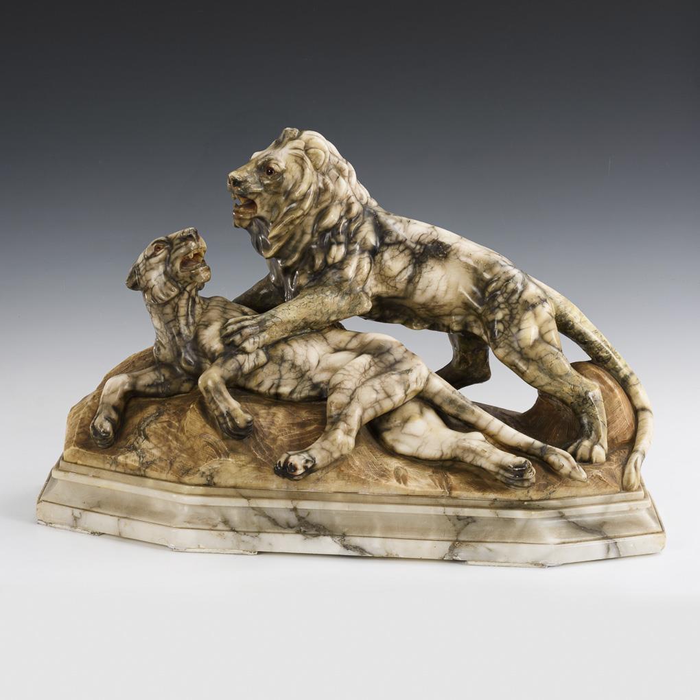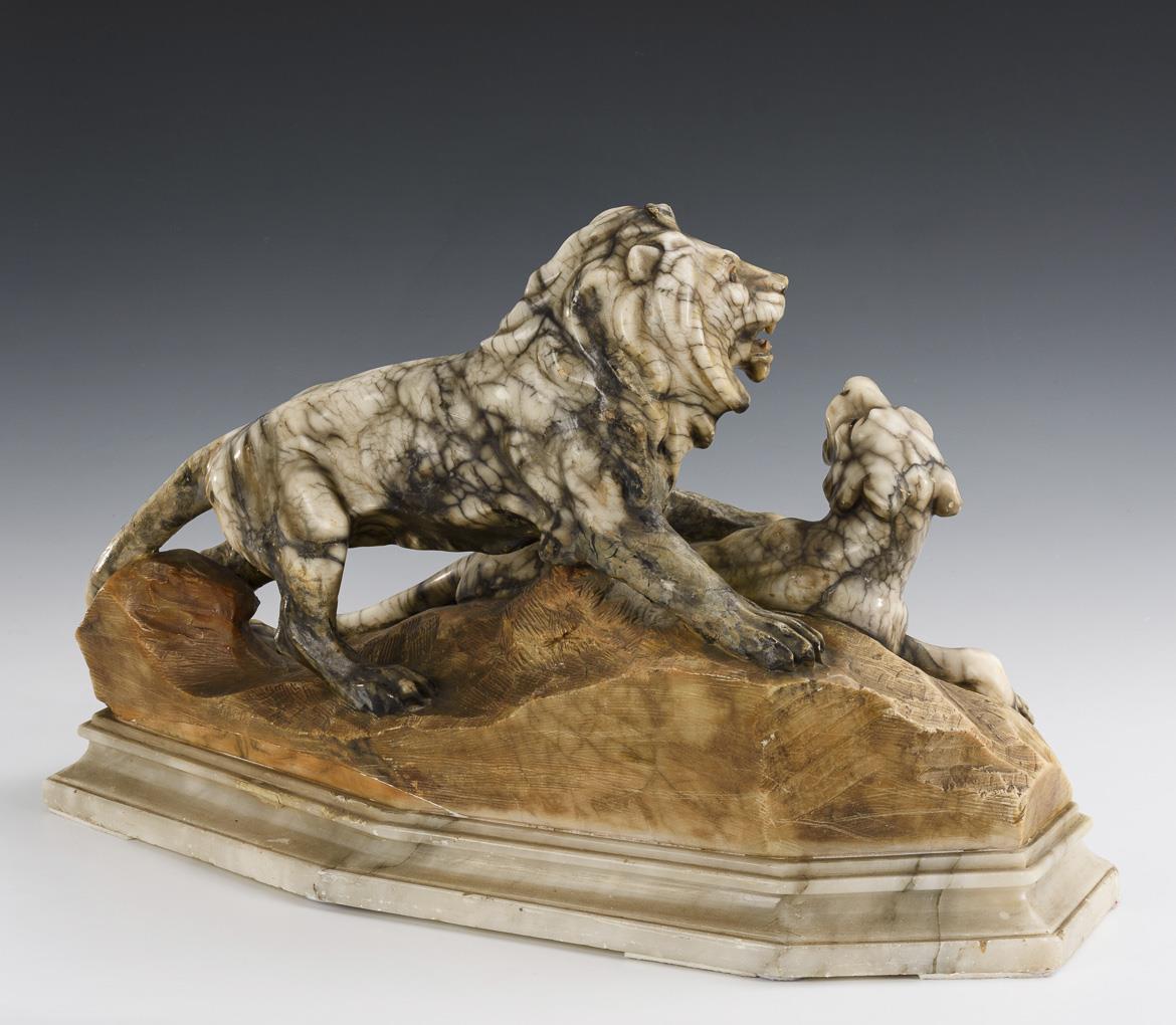 Zusammen mit dem bräunlich gefassten Natursockel aus einem Stück gefertigte Raubkatzen. Profilierte Marmor-Plinthe. Restauriert, Alters-/Gebrauchsspuren.