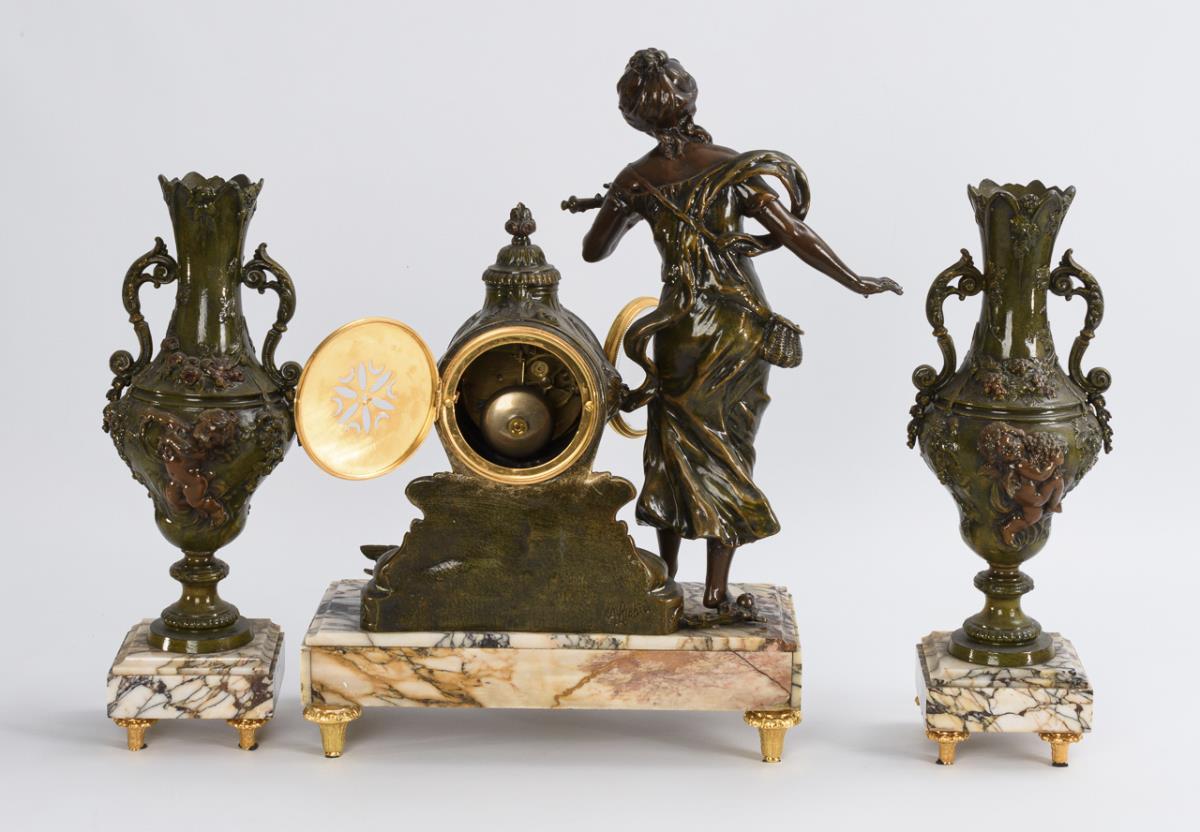 Rechtecksockel mit bekrönender Vogelfängerin, die eine Flöte mit Tauben hält (Die Bezaubernde). Nach dem Vorbild des französischen Bildhauers Hippolyte Francois Moreau (1832-1927) gefertigt. Dazu 2 passende Vasenbeisteller mit floralem Reliefdekor. Verwendung alter und neuer Teile, minimale Gebrauchsspuren.