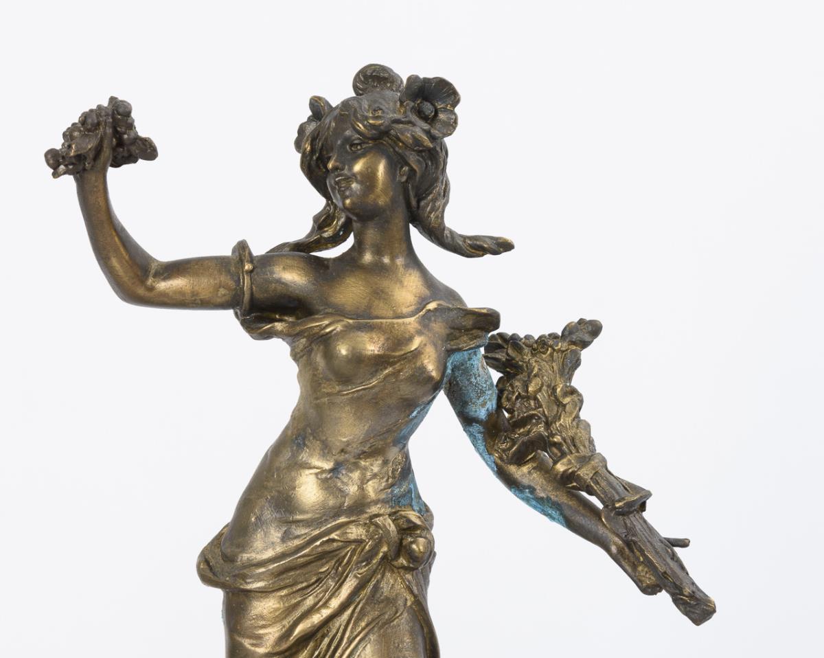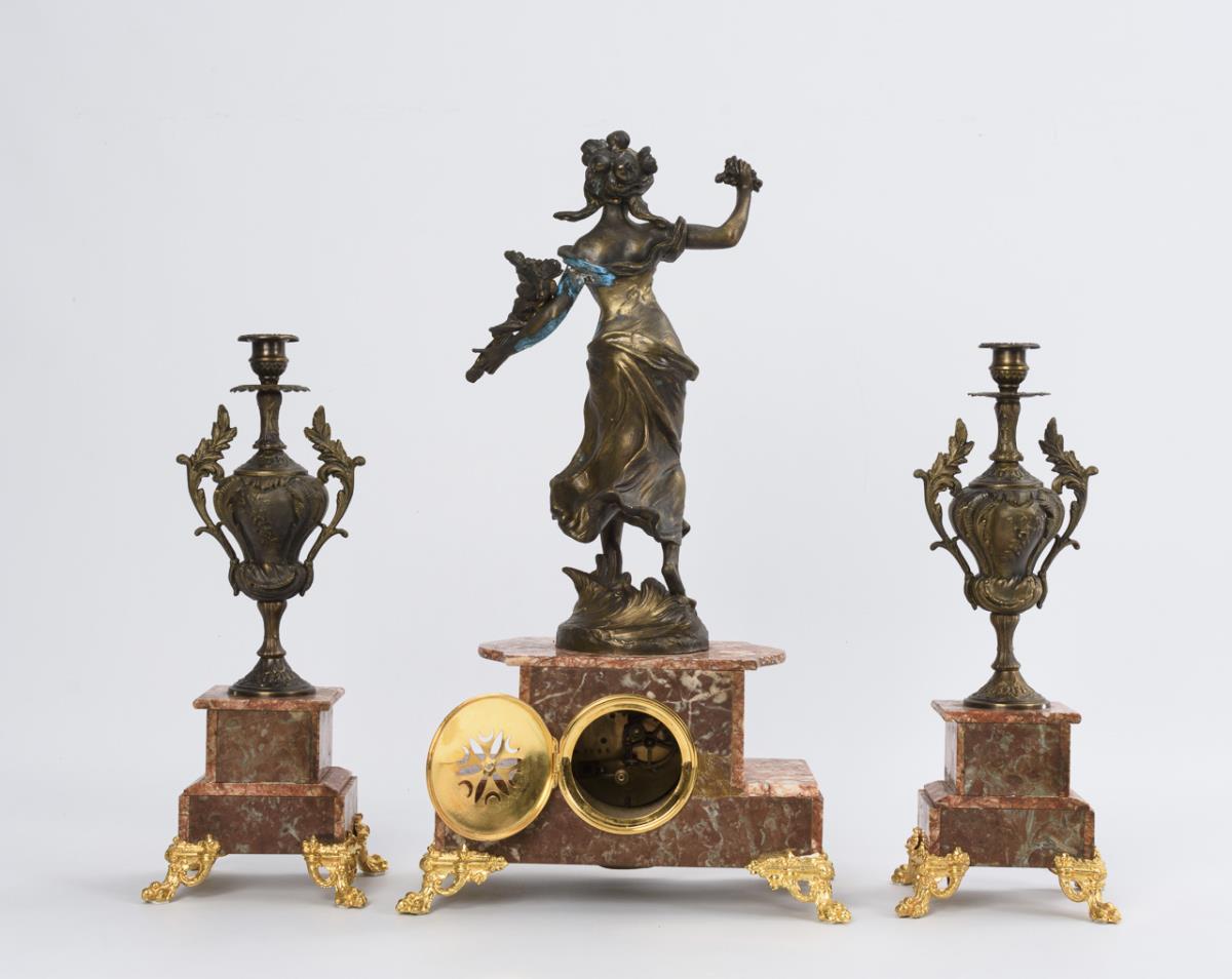 Pendule mit Jugendstil-Frauenfigur als Allegorie der Blumen auf rundem Natursockel. Nach dem Vorbild des französischen Bildhauers Henri Honoré Plé (1853-1922) gefertigt. Dazu 2 passende, 1-flammige Kerzenleuchter in Vasenform. Verwendung alter und neuer Teile, Altersspuren und Korrosionsflecken, Defekte und Retuschen.