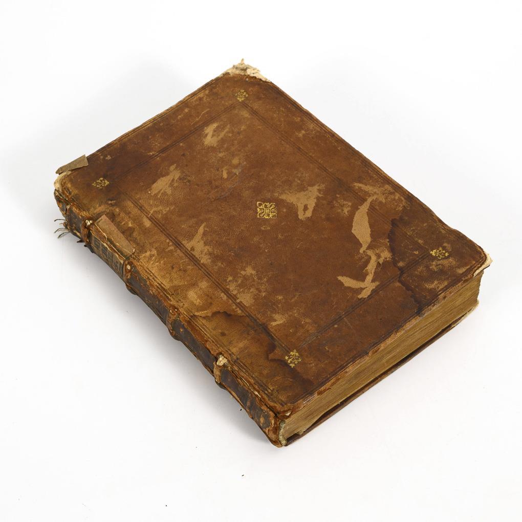 2 Teile in einem Band. (8), 172, (4), 248, (6) Seiten, meistens mit je 2 Abbildungen von Herrscherporträts auf Münzen mit biographischen Beschreibungen in französischer Sprache. Block sehr gut erhalten, im vorderen Teil etwas wasserrandig, Ledereinband mit stärkeren Altersspuren, Rücken gebrochen. Deckel unter Verwendung alter Handschriften gebunden.
