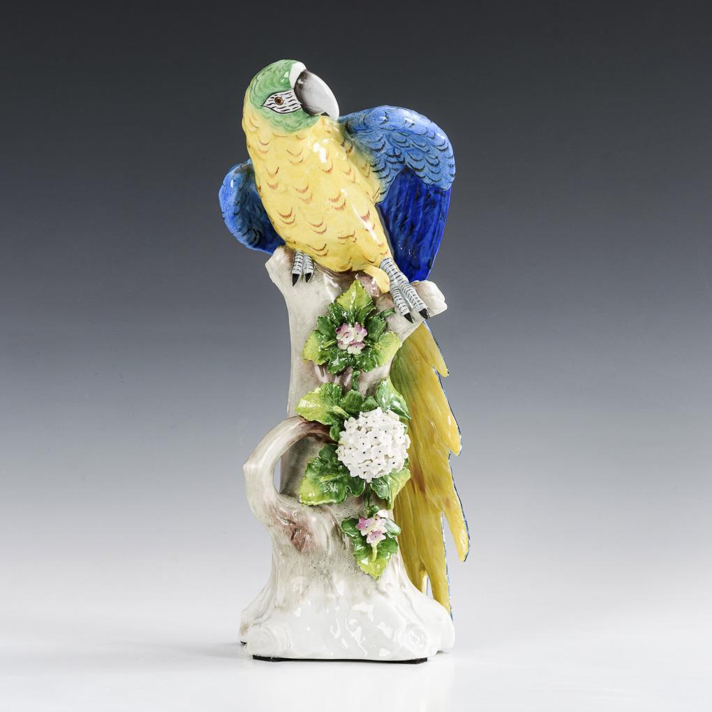 Auf einem hohen Baumstamm mit Schneeballenblüten sitzender Ara.