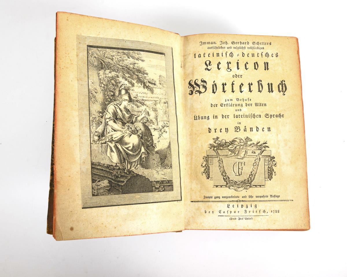 2. vermehrte und verbesserte Auflage. Ein Band Deutsch - Latein: 40 Seiten und 2840 Spalten. 3 Bände Latein-Deutsch: zusammen 7832 Spalten. Alle im Halbledereinband. Alters- und Gebrauchsspuren.