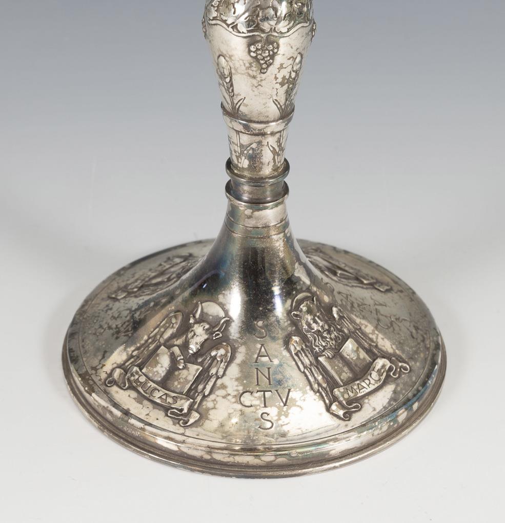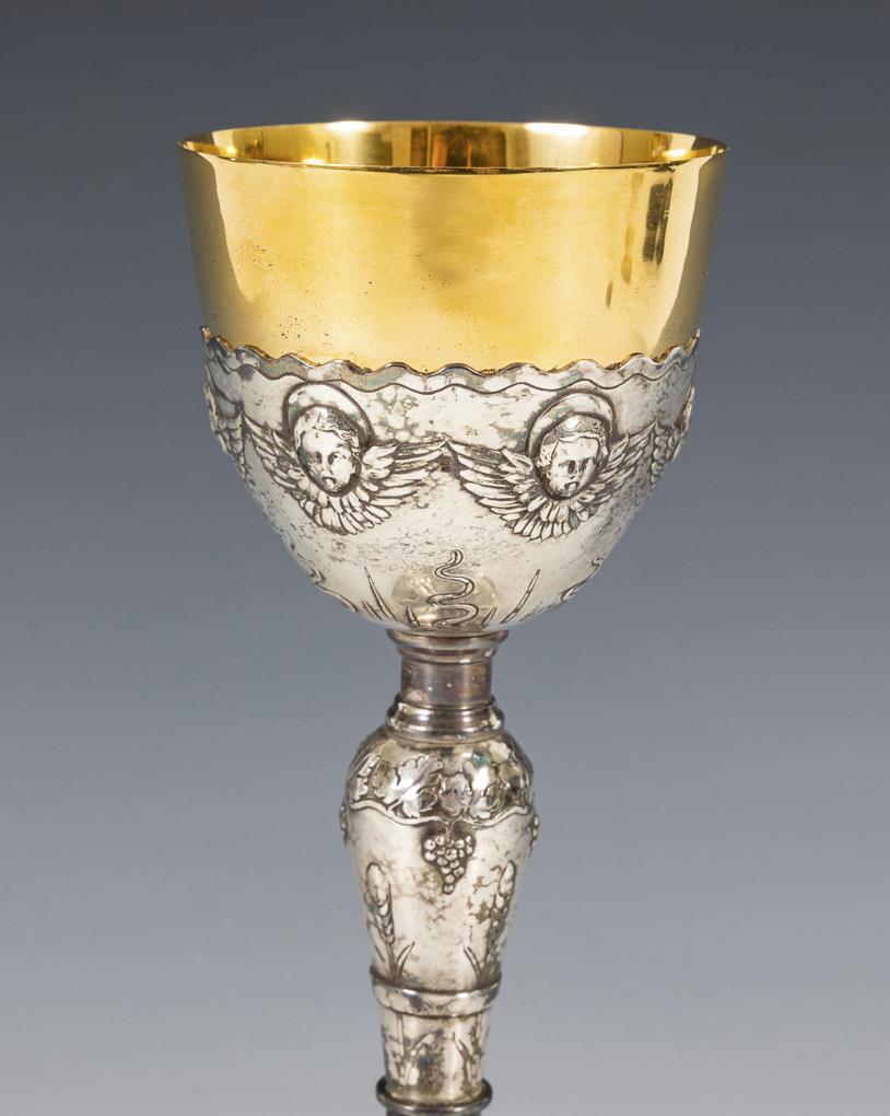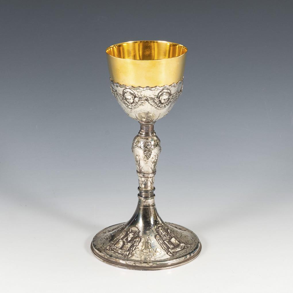 Reich reliefierter Kelch mit Engelsköpfen auf der teilvergoldeten Kuppa und den 4 Evangelisten-Symbolen auf dem Rundfuß. Gebrauchsspuren, am Stand minimal gedellt.