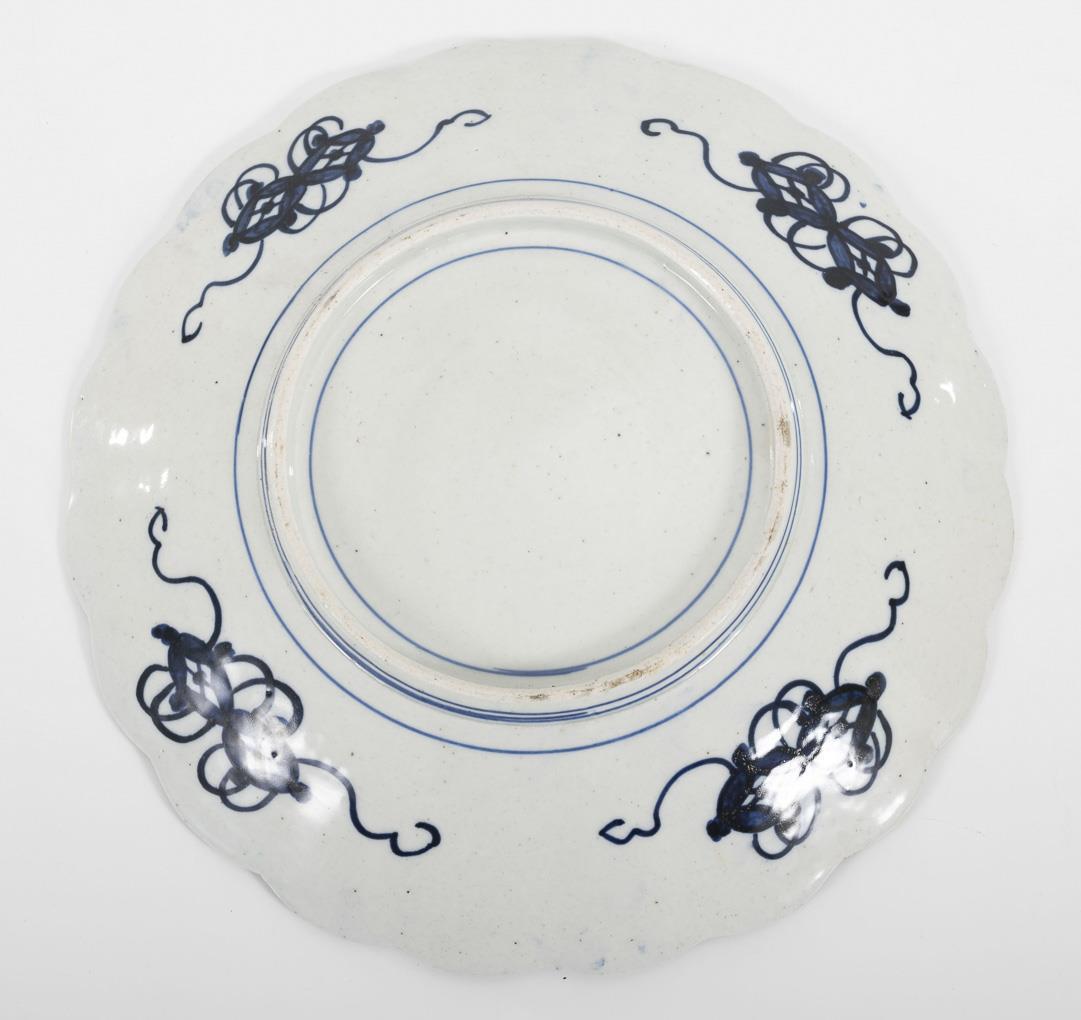 Alle mit gewelltem Rand und typischem Dekor in Unterglasurblau und Rot. Unterseiten dezent bemalt. Einer mit produktionsbedingten Glasurfehlern. Ein Teller mit kleinem Chip.