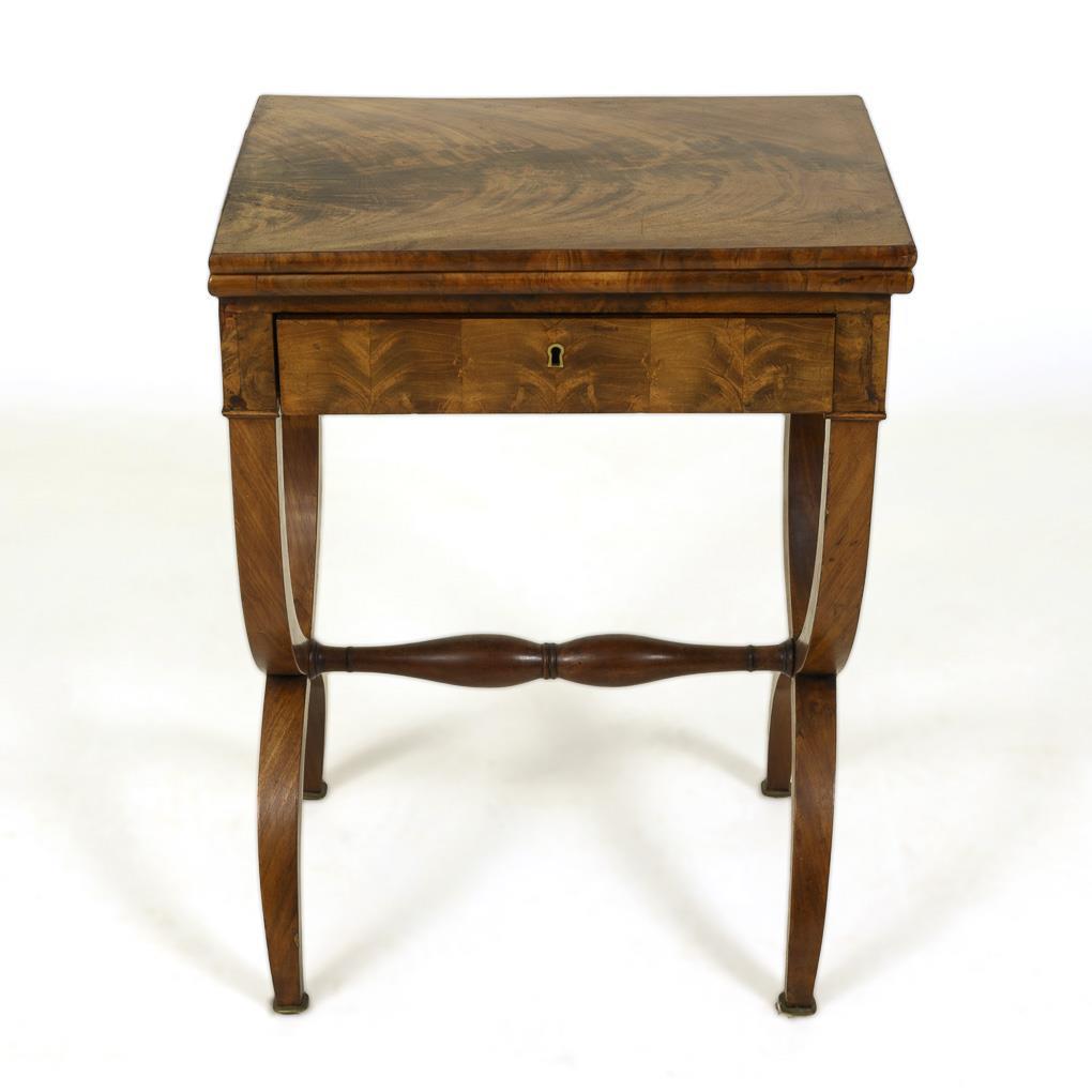 Raum sparender Tisch als Kombination von Näh- und Spieltisch, mit Zargenschub, auf Brückenbeinen mit gedrechselter Fußverstrebung; verziert mit Spiegel- und Maserfurnier; Tischplatte mit Näh- und Klappfunktion - innenseitig mit Lederbezug. Alters-/Gebrauchsspuren, restauriert mit Ergänzungen, leicht verzogen.