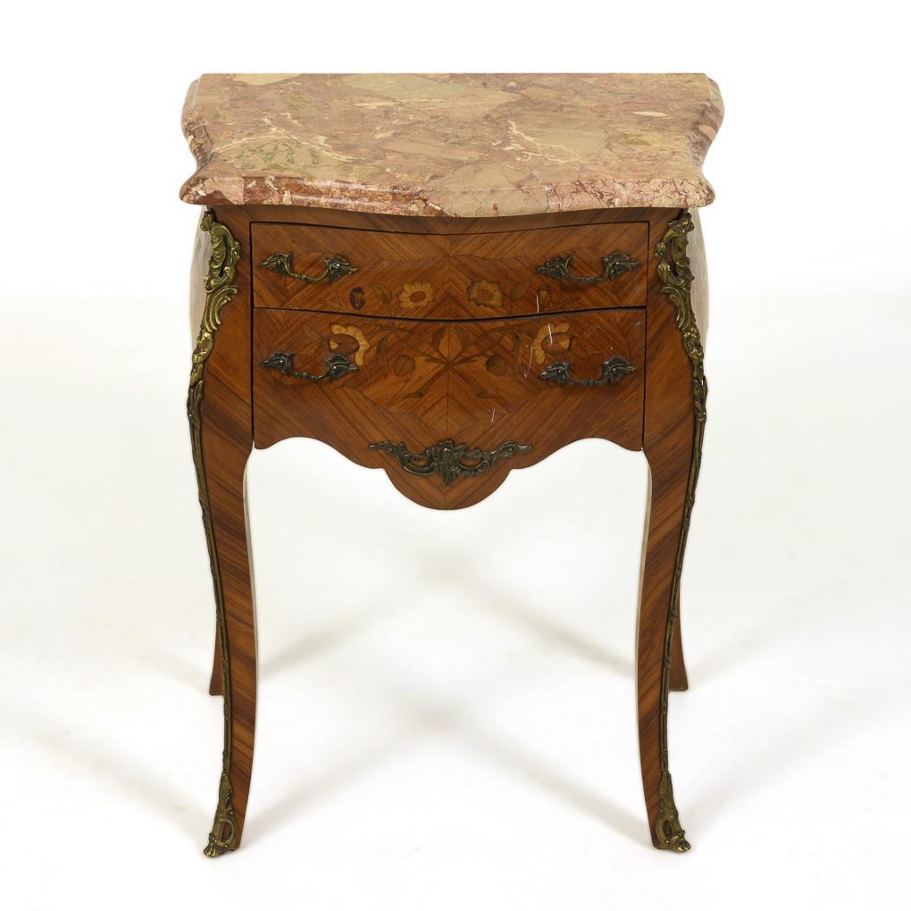 Kleine 2-schübige, stiltypisch geschwungene Pfeilerkommode im Rokoko-Stil mit rötlich-geaderter Marmorplatte, dekoriert mit üppigen Bronzeapplikationen und Blumenmarketerien. Leichte Alters-/Gebrauchsspuren.