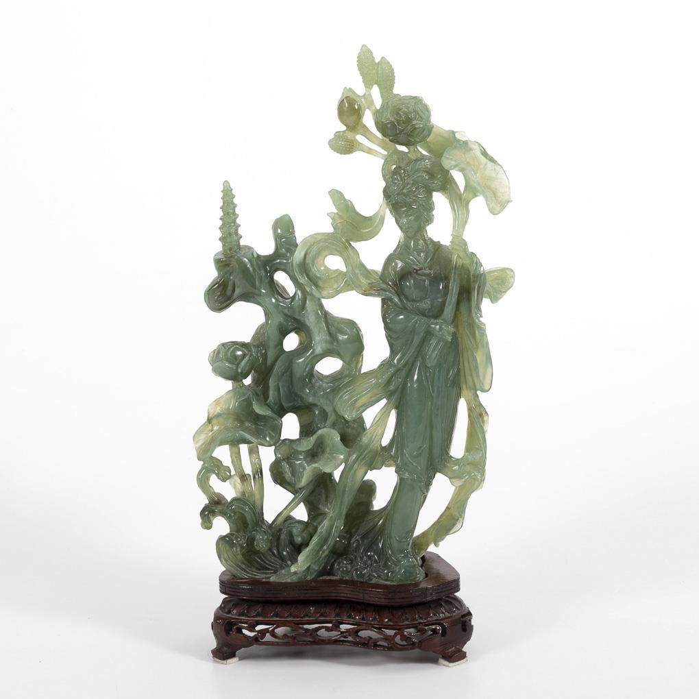 Große Nephrit-Schnitzerei mit Frauenfigur und Blumen.