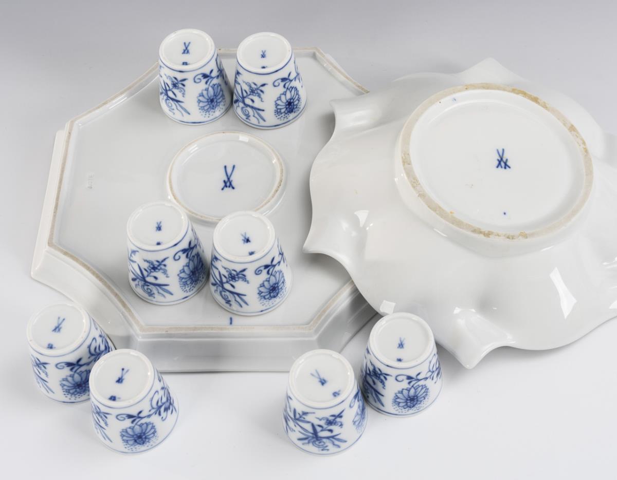 Tablett, Zigarrenascher und 8 Zwiebelmuster-Schnapsbecher. Meissen.