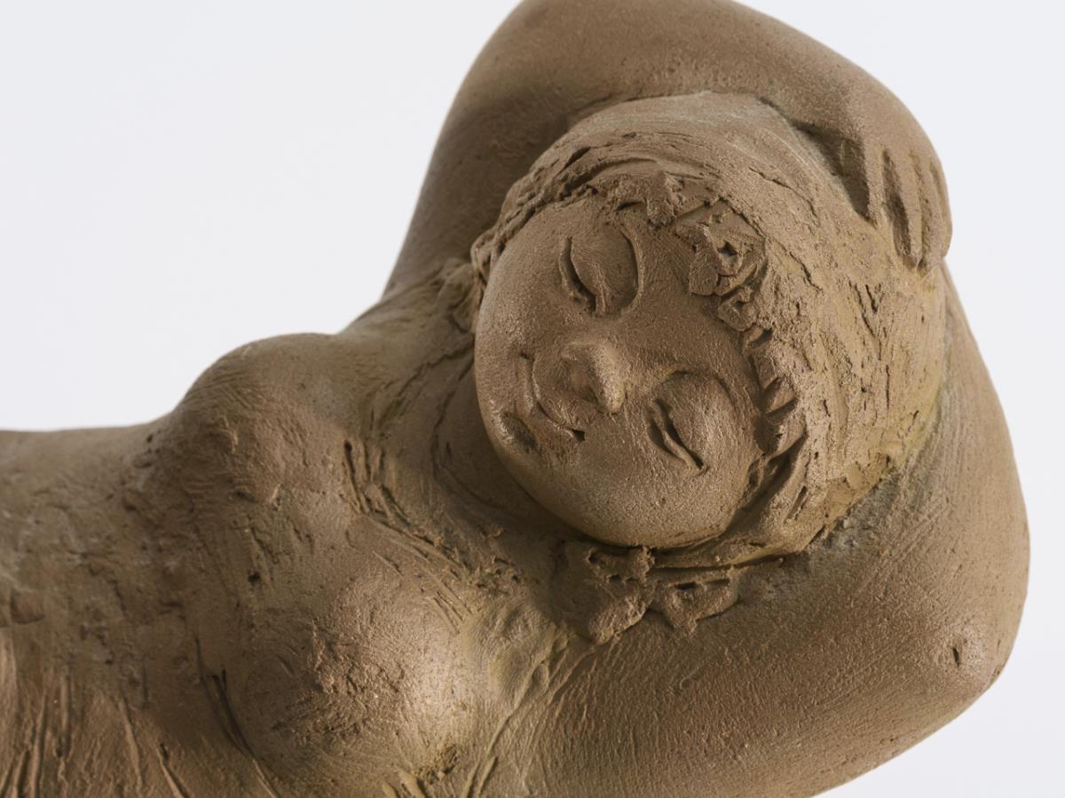 Genussvoll in einer Wanne liegende Frau. Entwurf für den Wilhelminenbrunnen in Westerland/Sylt. Minimale Chips an den Zehen.