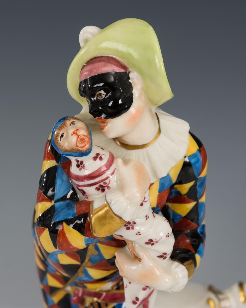 Ein Äffchen als Wickelkind tragender Harlekin. Griff der Klatsche restauriert.