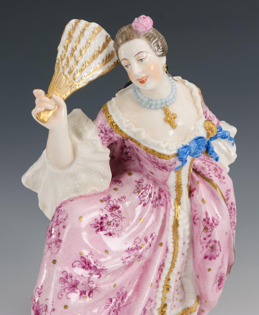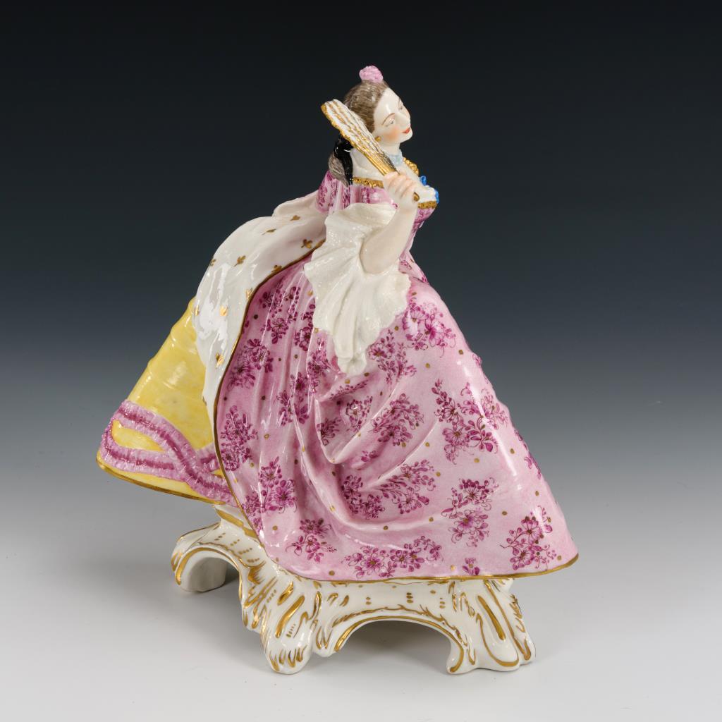 Auf einem Rocaillesockel stehende Rokokodame im Reifrock, einen Fächer haltend.