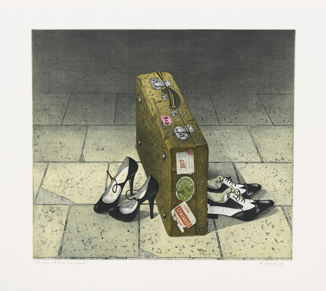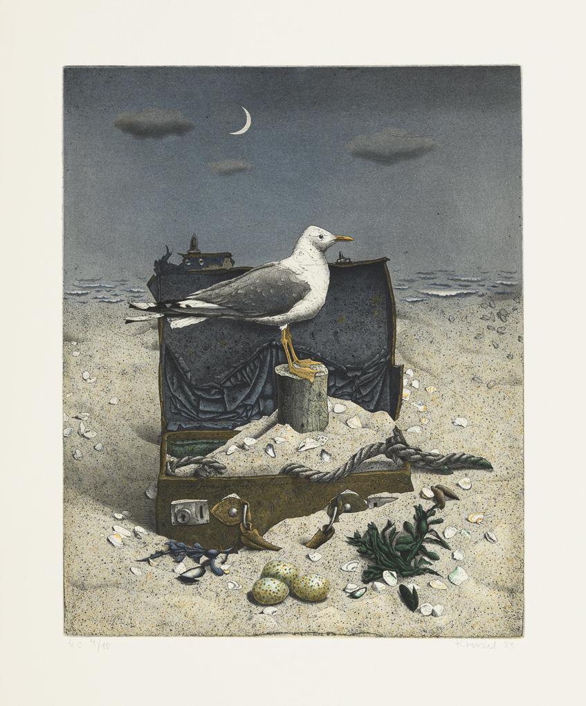 Möwe am Strand, Exemplar: h.c. 4/10, [19]89, Druckplatte: 49 x 39,5 cm, Blatt: 75,5 x 58 cm, Randbereich knick- und griffspurig | "Reise zu zweit", Exemplar: 74/100, [19]95, Druckplatte: 43,7 x 49,5 cm, Blatt: 63 x 73 cm.