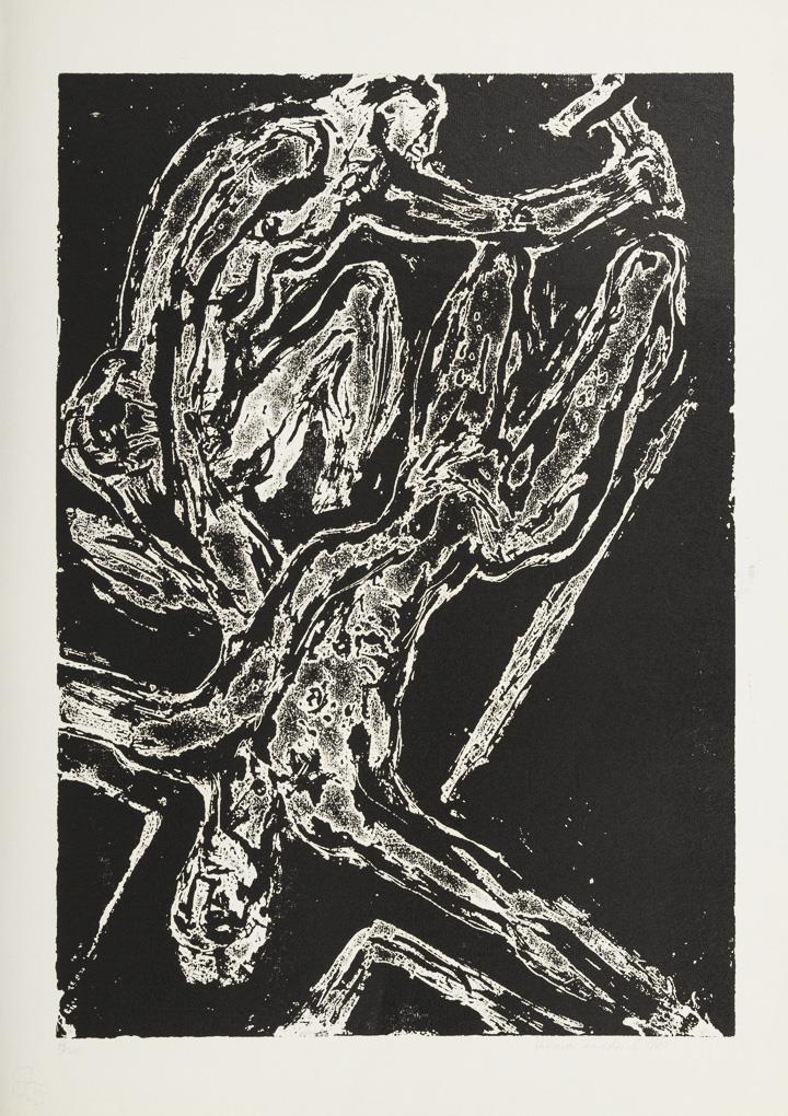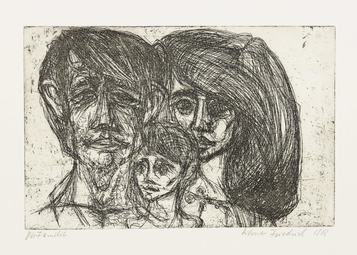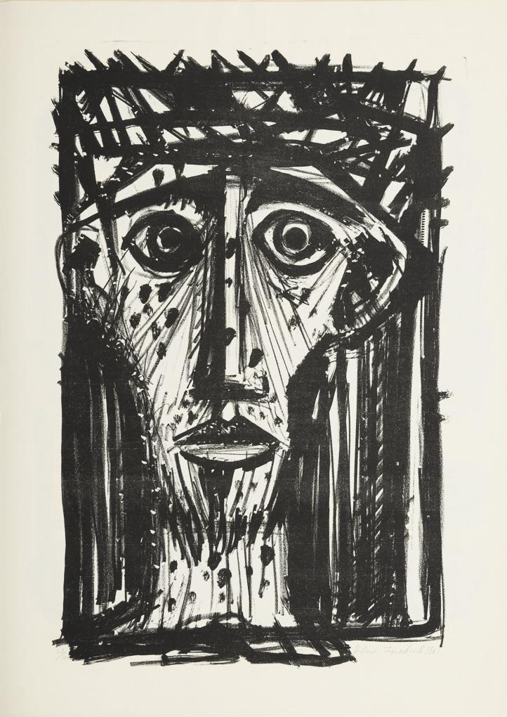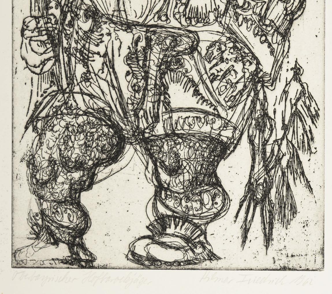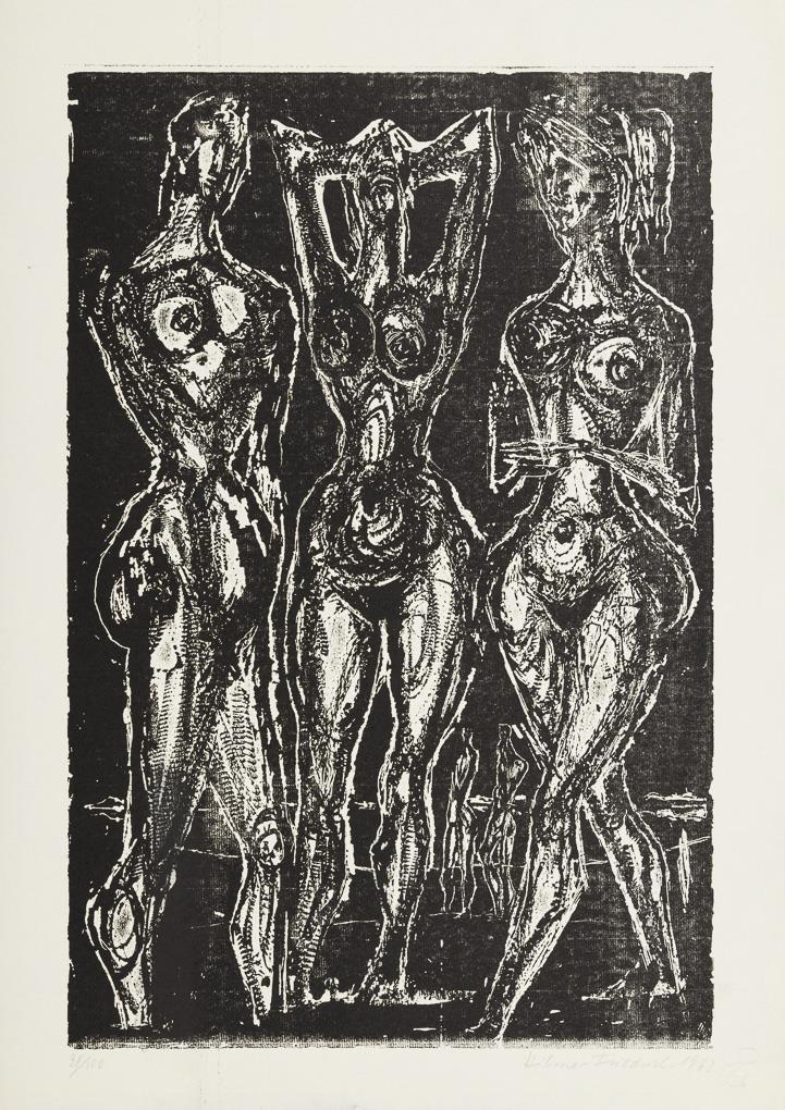 "3 Frauen", Holzschnitt, Bleistiftsignatur, 1962, Exemplar: 98/100, Druckstock: 50 x 32,7 cm, Blatt: 59,5 x 42 cm, minimal griff- und knickspurig | "Oberbayrischer Hofbarockjäger", Radierung, Bleistiftsignatur, 1962, Druckplatte: 24,6 x 16,7 cm, Blatt: 53,5 x 40 cm, etwas knickspurig | "Die Familie", Radierung, Bleistiftsignatur, 1962, Druckplatte: 16,3 x 24,6 cm, Blatt: 39,5 x 53 cm | "Kreuzabnahme", Holzschnitt, Bleistiftsignatur, 1962, Exemplar: 99/100, Druckstock: 49,5 x 35 cm, Blatt: 59 x 41,8 cm, minimal griff- und knickspurig | "Ecce Homo", Lithografie, Bleistiftsignatur, 1962, Exemplar: 20/100, Abbildung: 52 x 33 cm, Blatt: 59 x 42 cm, minimal knickspurig | "Pferd", Lithografie, Bleistiftsignatur, 1961, Exemplar: 95/100, Abbildung: 39 x 46 cm, Blatt: 42 x 59 cm, minimal knickspurig, Randbereich leicht lichtgebräunt.