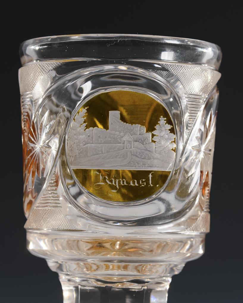 Zylindrische Kuppa mit Kerb- und Steinelschliff, facettierter Schaft und mehrpassiger Fuß mit Bodenstern. Auf der Kuppa drei hochgeschliffene Medaillons, davon 2x mit einer gravierten Ansicht von Warmbrunn und Kynast und 1x mit der Datierung "14. August 31 1832".