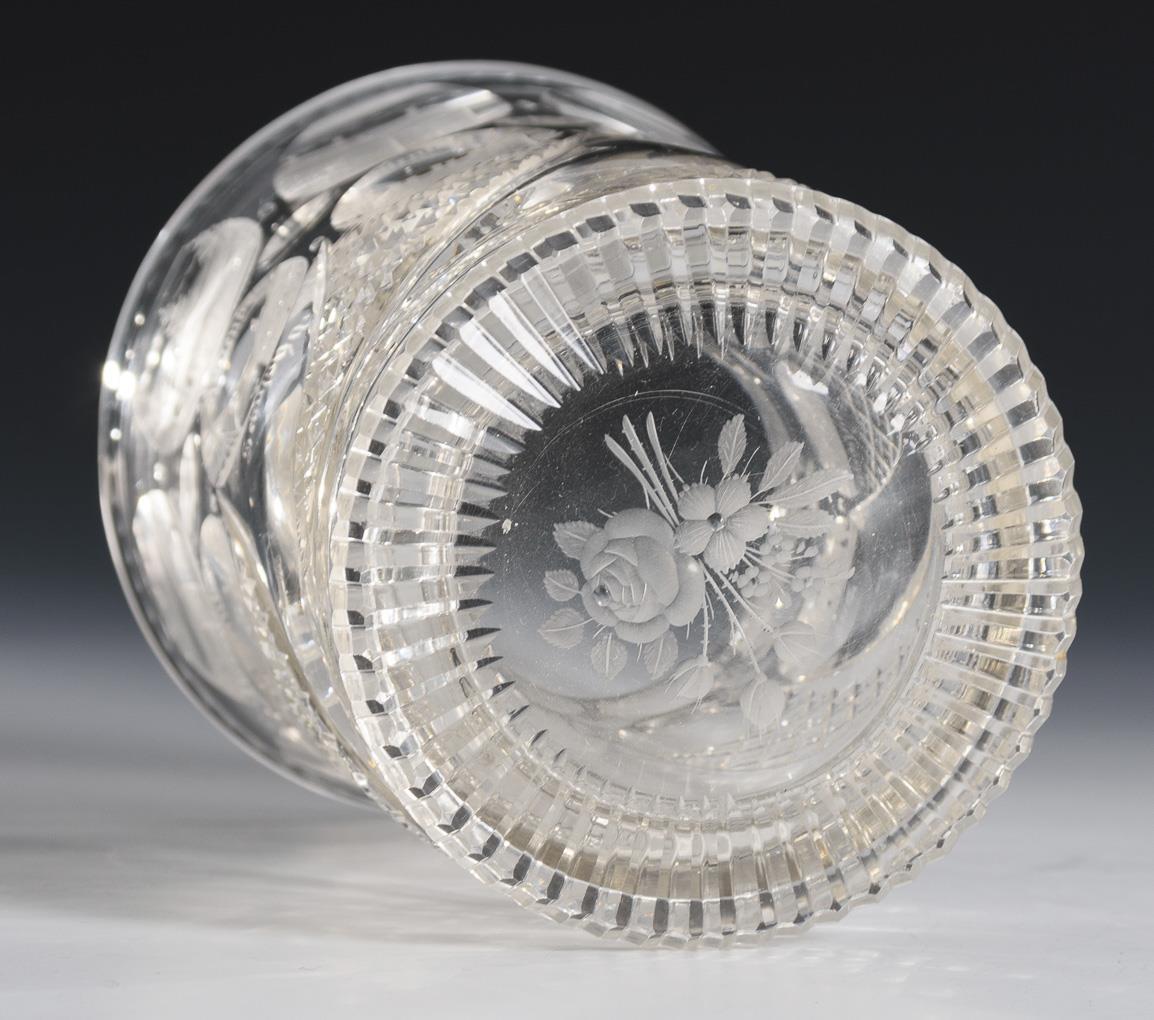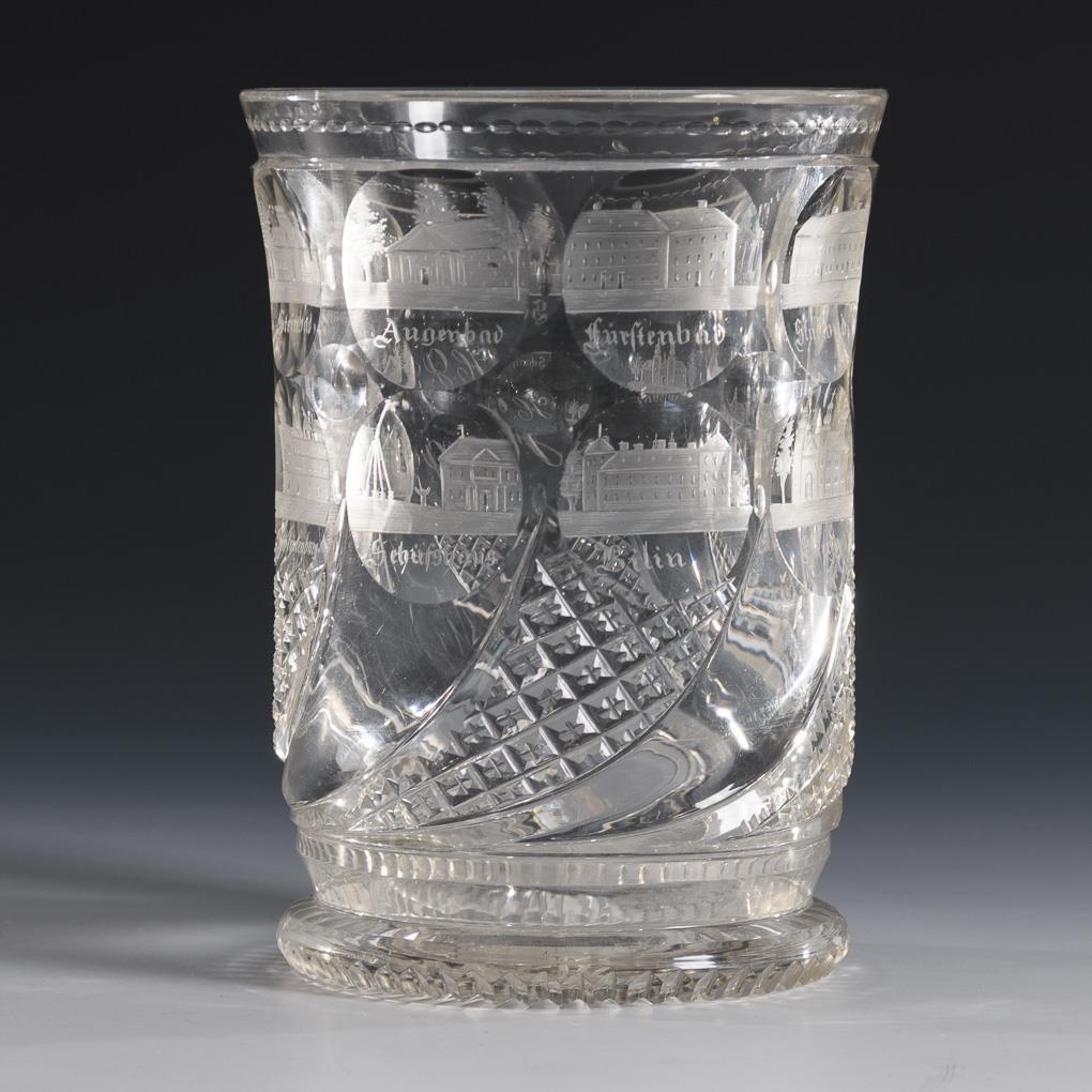 Glockenförmiger Becher mit Rundfuß, Kerb-, Steinel- und Linsenschliff. In 15 Linsen gravierte Ansichten von Teplitz (Schlangenbad, Gartentempel, Steinbad, Schlackenburg etc.), eine Linse mit dem Monogramm "H.G.".