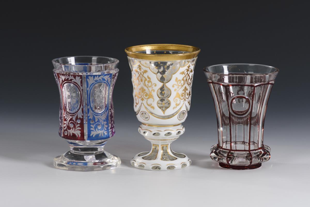 1x gefußter Glockenbecher aus farblosem Glas mit Zinnemailüberfang, Linsen- und Facettenschliff sowie ornamentaler Goldmalerei (H 14 cm). / 1x gefußter Glockenbecher aus farblosem, teils rot und blau gebeiztem Glas mit Linsenschliff und vegetabiler Gravur (H 12,5 cm). / 1x facettierter Kraterbecher aus farblosem, teils rot gebeiztem Glas mit einer schauseitigen hochgeschliffenen Kartusche mit der gravierten Darstellung zweier Füllhörner mit Blumen und dem Spruch "Glück begleite Dich stets." (H 11,5 cm). 1x minimaler Goldabrieb.
