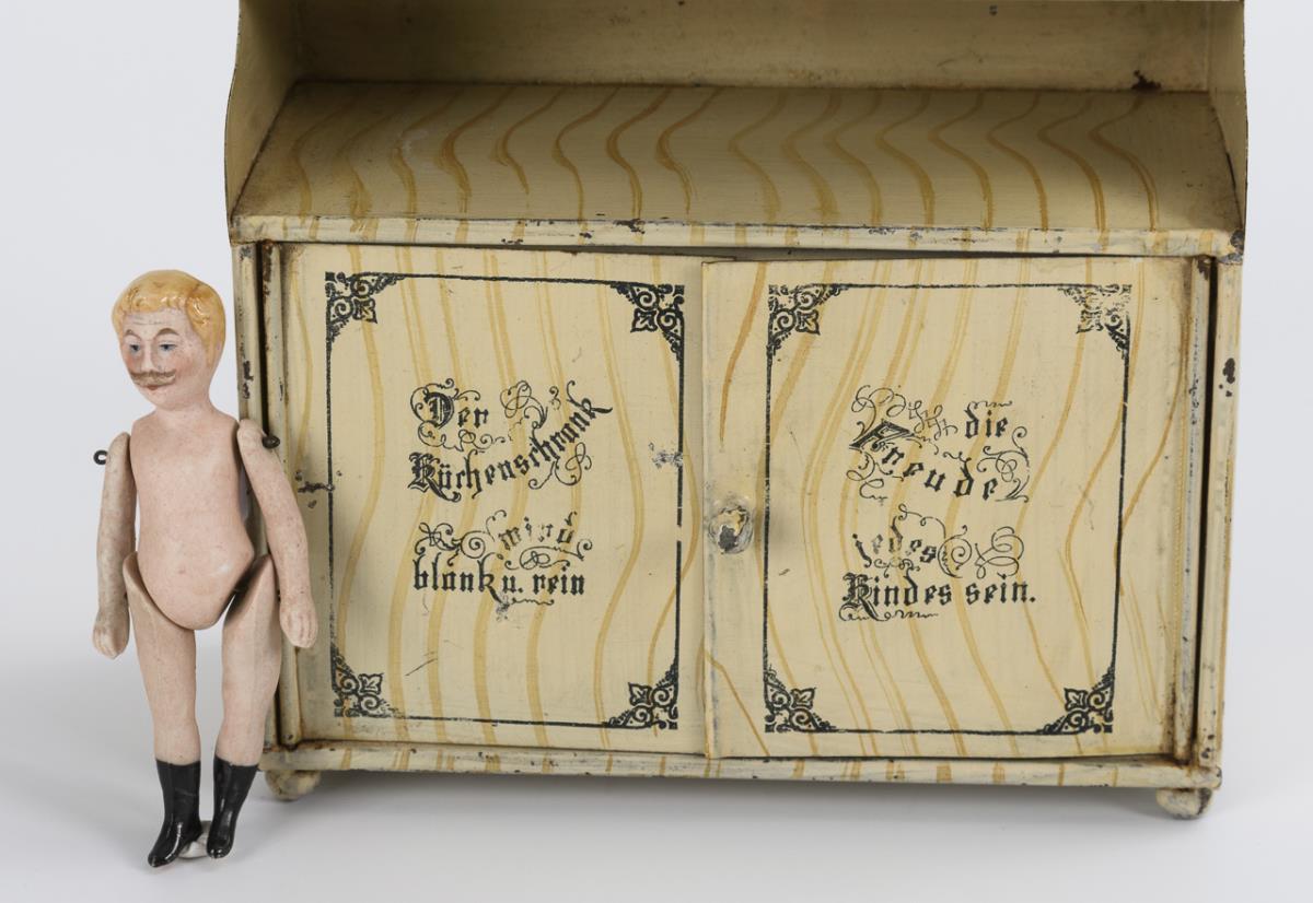 Heller Puppenküchenschrank mit Fliegengittern und Aufschrift "Der Küchenschrank wird blank und rein die Freude jedes Kindes sein". 28 x 17 x 7 cm. Dazu unbekleideter Puppenstuben-Herr mit modelliertem Schnurrbart, L 9 cm. Altersspuren, rückseitig etwas Rost.