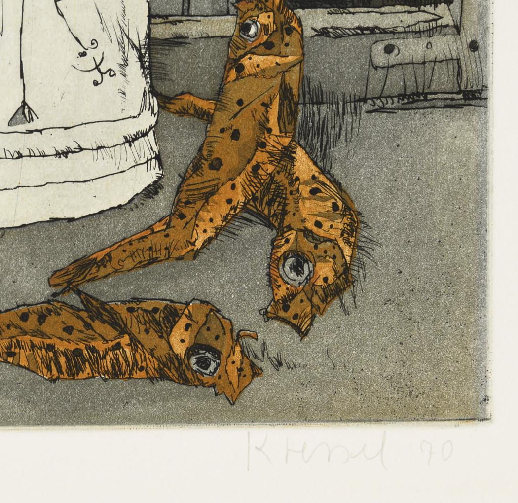Gasthof, Exemplar: 34/100, [19]77, Druckplatte: 40 x 49,5 cm, Blatt: 57 x 69,5 cm, auf grauem Karton | Porträt und Kanne mit Strohblumendekor in verfallener Gegend, Exemplar: 26/XXX, [19]70, Druckplatte: 49 x 29,5 cm, Blatt: 75 x 56,3 cm.