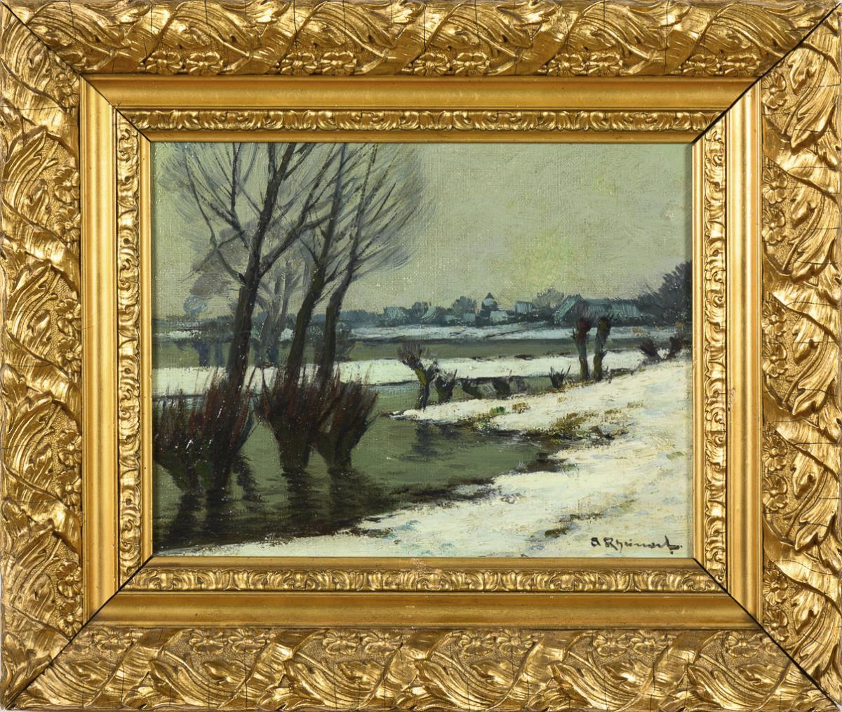 Flache Landschaft mit verschneiten Ufern unter grauem Himmel. Eine kleine restaurierte Stelle mit Hinterklebung.