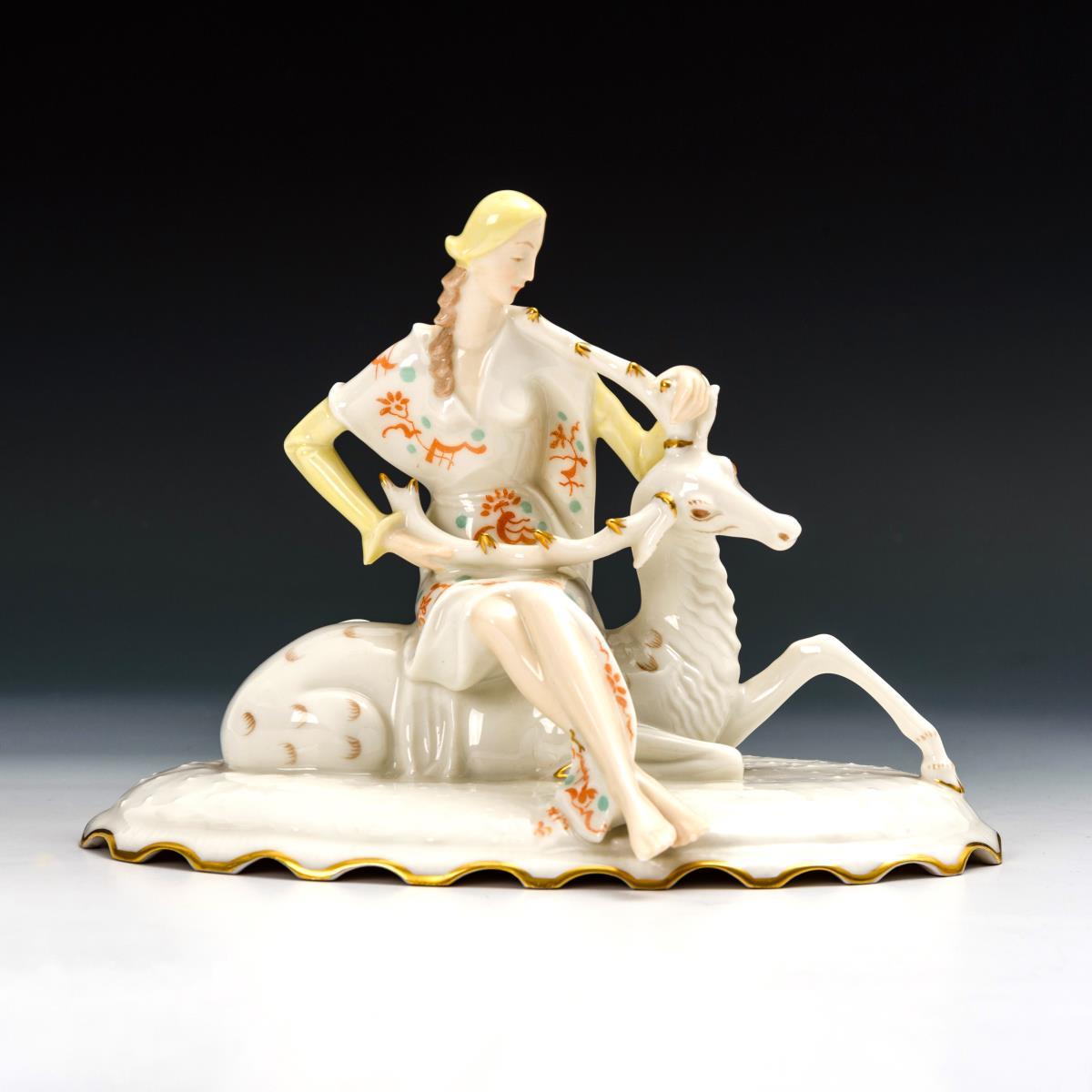 Art-déco-Plastik: Frau mit Hirsch. Hutschenreuther.
