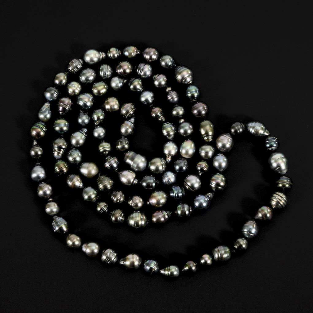 Durchgehende Schnürkette mit verschiedenen, partiell gerillten Barockperlen in Einzelverknotung.