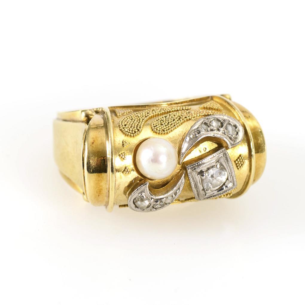 Hoher Ringkopf mit Zuchtperle, gefasstem Altschliff-Diamant, 6 kleinen eingelassenen Diamantrosen und Granalienzier, zwischen breiter Schiene.
