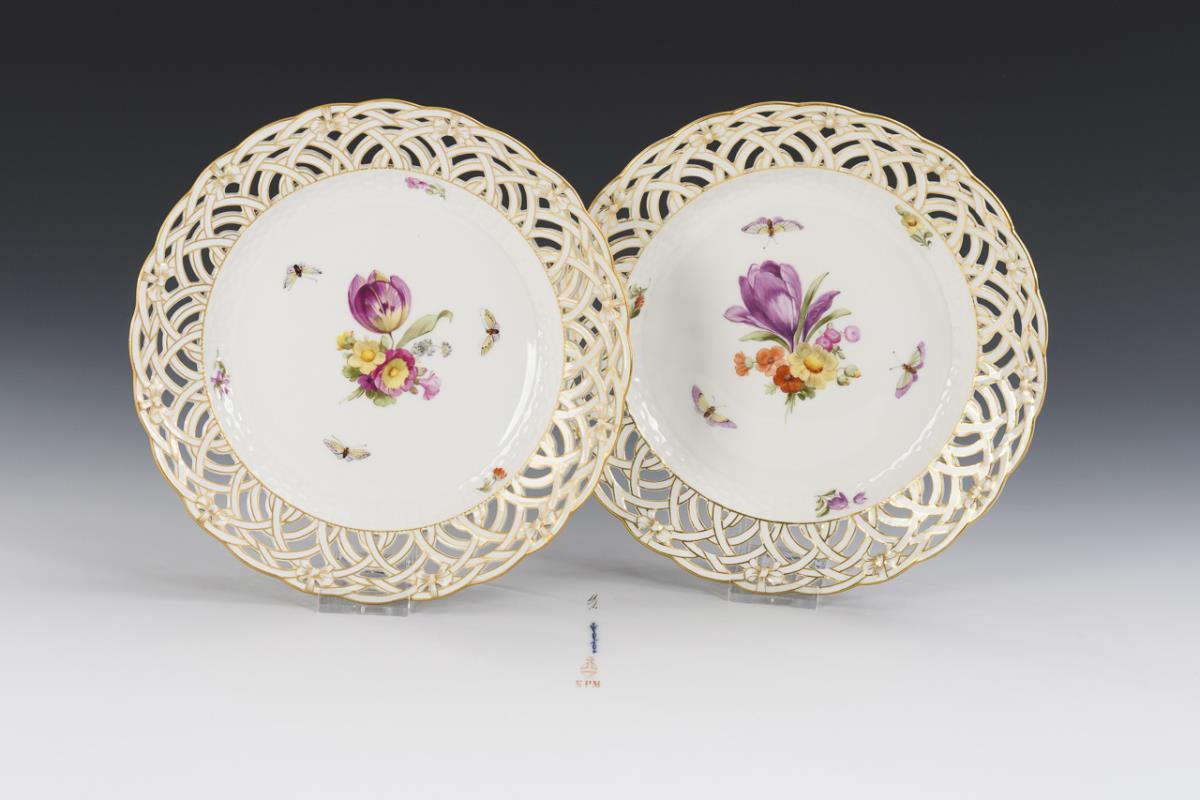 2 Dessertteller mit Blumen- und Insektenmalerei. KPM Berlin.