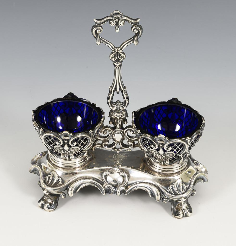 Reich reliefierte und durchbrochene Doppelmenage mit 2 blauen Glaseinsätzen. Winzige Randbestoßungen an den Glaseinsätzen.
