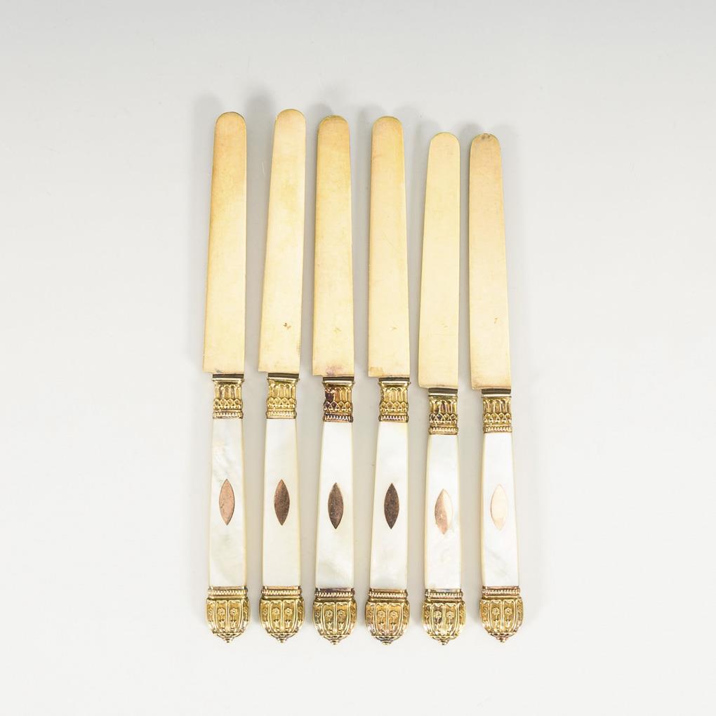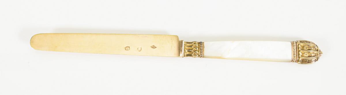 Schlichte Messer mit vergoldeter Silberklinge und Perlmuttgriffen mit Reliefzier.