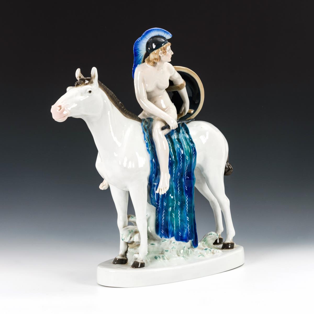 Auf einem Schimmel reitende Amazone mit Schild und Helm .