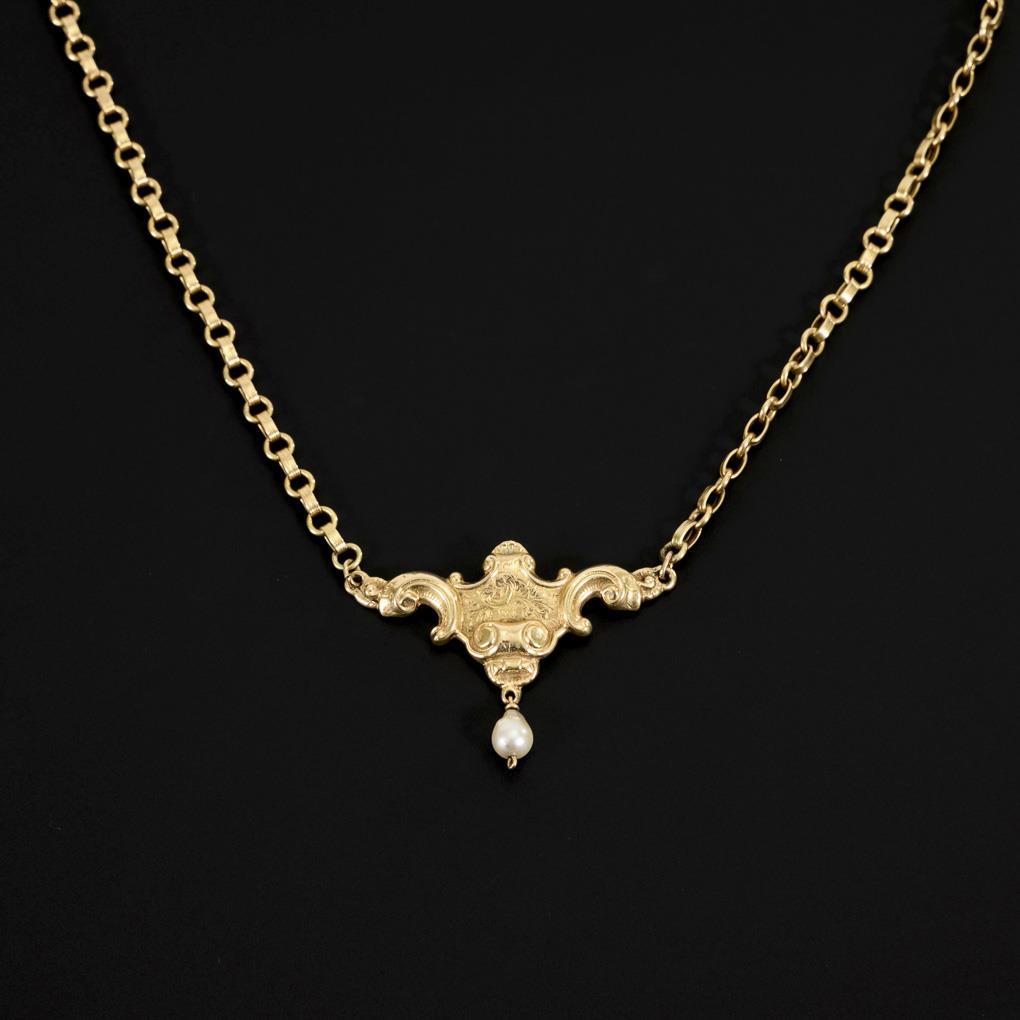 Reliefiertes Schauteil mit abgehängter Perle, zwischen Ziergliederkette an Kastenschloss.