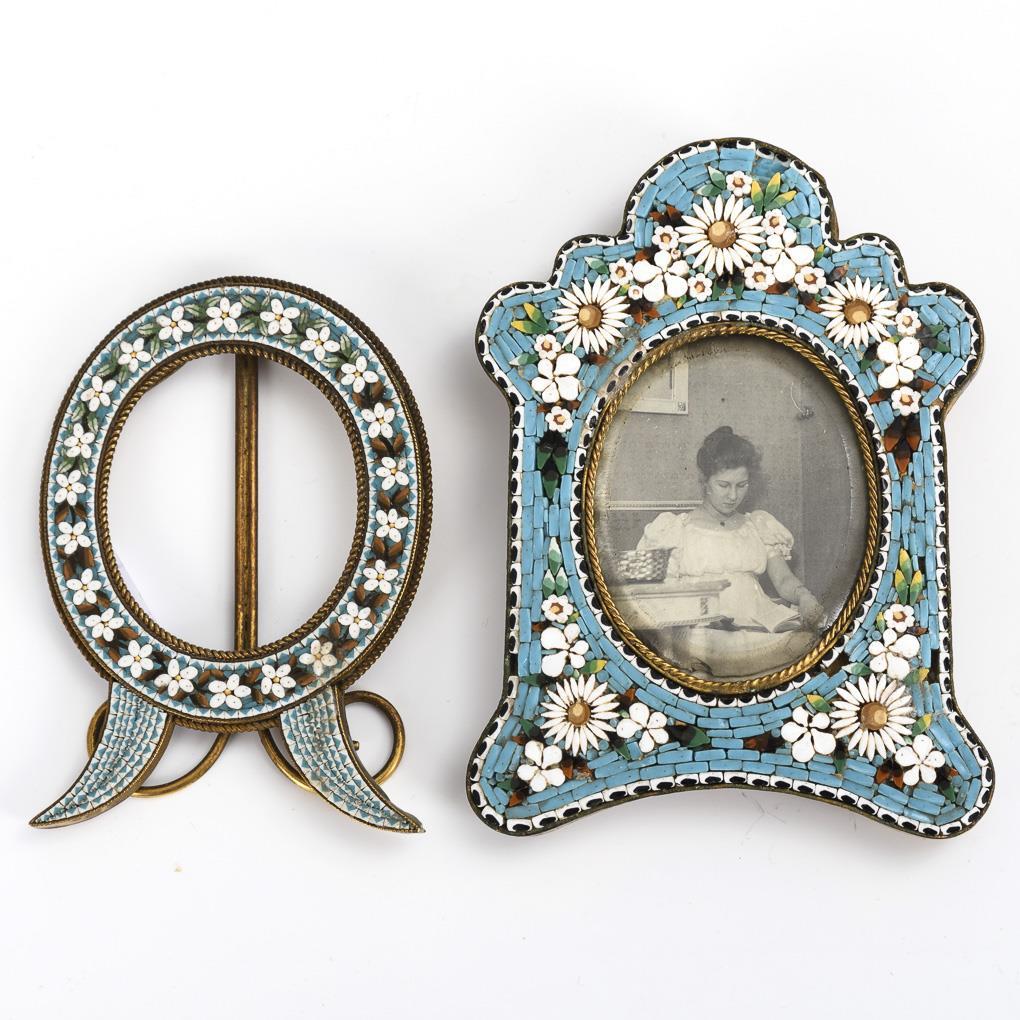 2 Aufstellrahmen; in den Fronten je feine florale Mosaiken. 1x verglast mit altem Foto. Minimale Alters-/Gebrauchsspuren.
