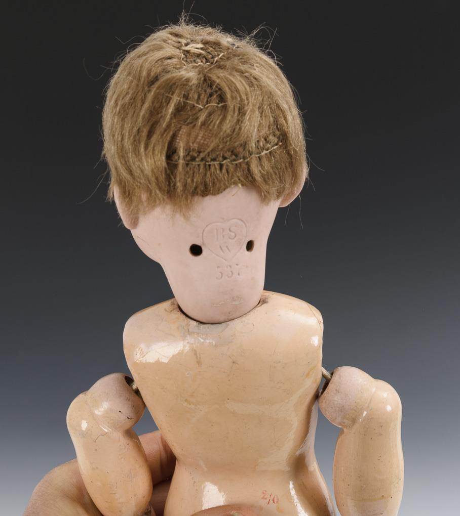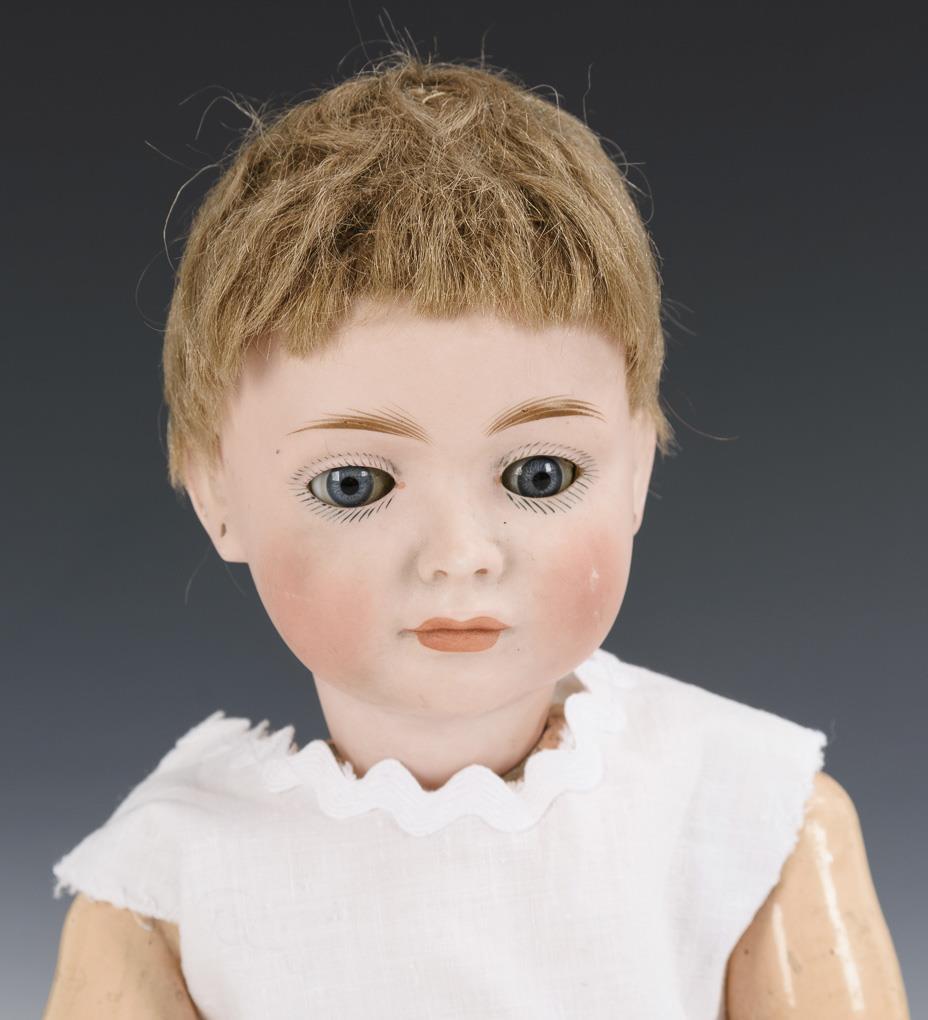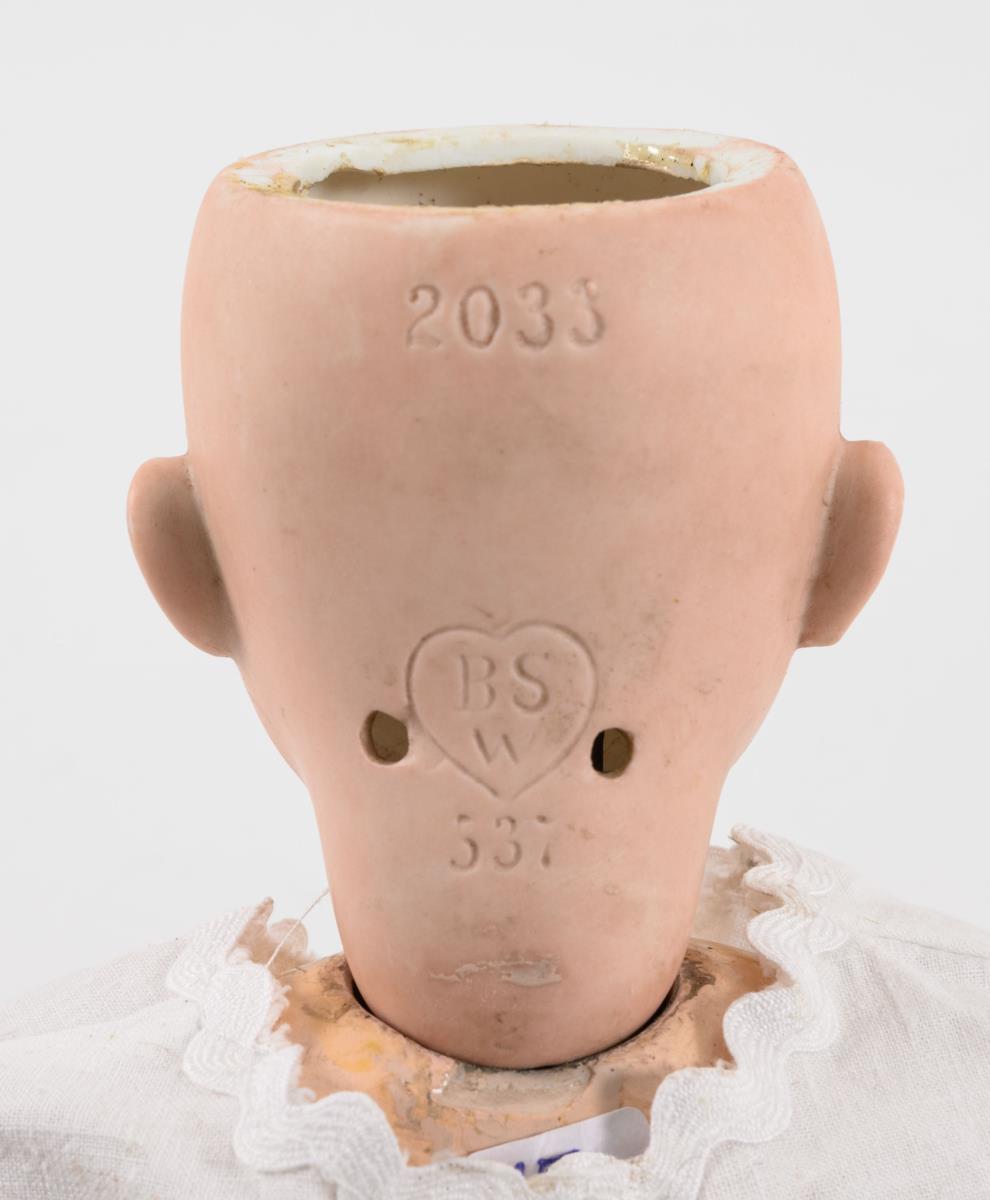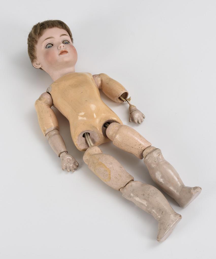 Kurbelkopf, blaue Schlafaugen, geschlossener Mund, Ohrlöcher, festgeklebte blonde Mohairperücke. Defekter 11-teiliger Gliederkörper mit Übermalungen. Weißes Kleidchen. Kopf nicht durchleuchtet. Körper unvollständig, locker gespannt.