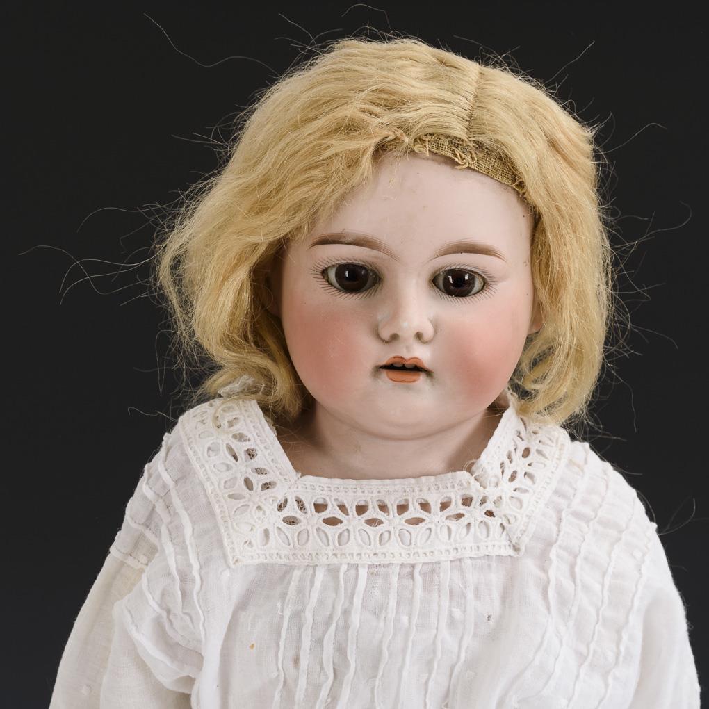 Braune Schlafaugen, Mohairperücke. Lederkörper mit Kniezwickeln und Unterarmen aus Celluloid. Weißes Kleid, alte schwarz-weiße Lederschuhe. Kopf durchleuchtet: ohne Defekte.