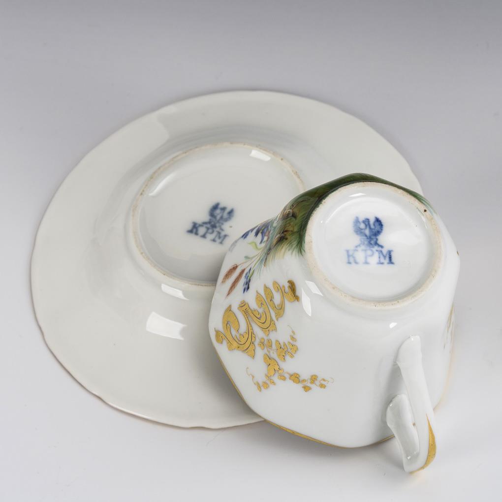 Polychrom bemalt, goldstaffiert. H Tasse 7,5 cm, Ø originale Untertasse 15,5 cm.