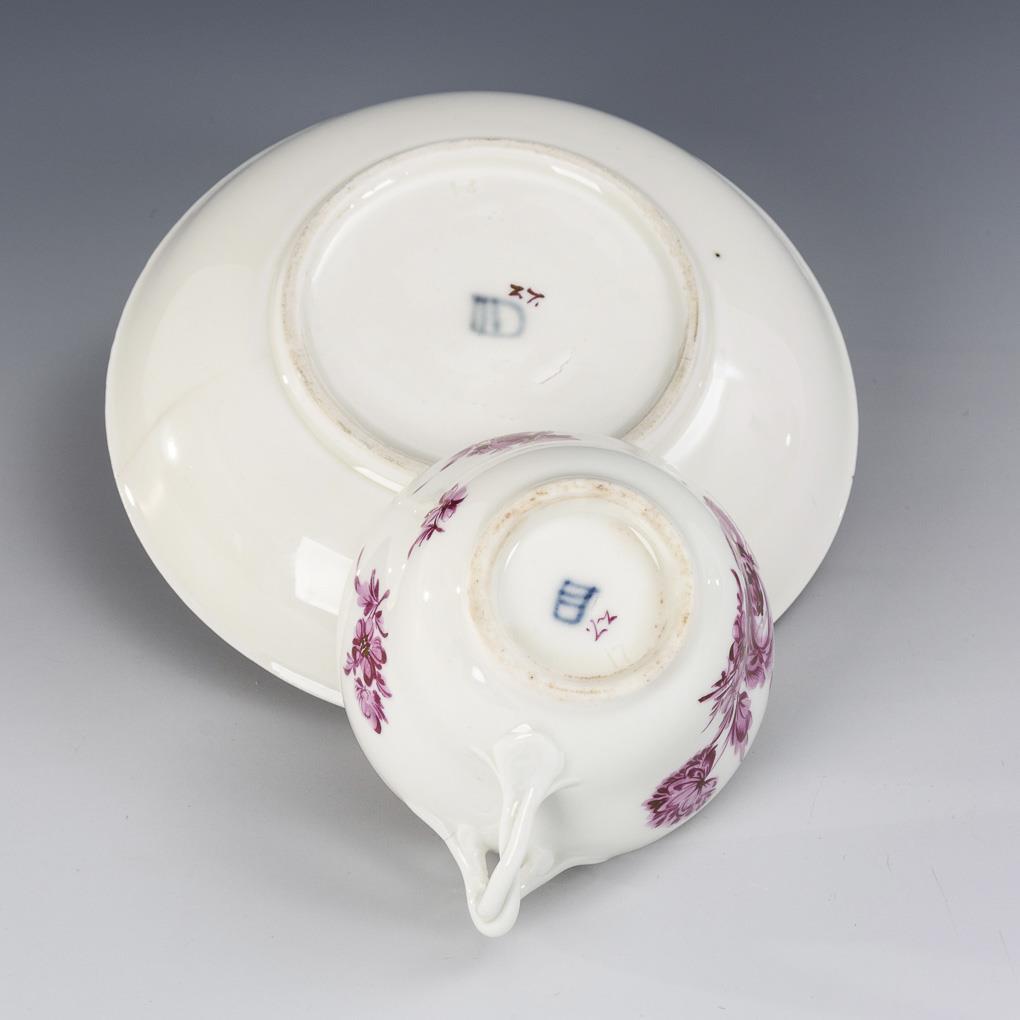 Glockentasse mit gewundenem Henkel und purpurfarben gemalten Blumenbuketts. Haarriss in der Untertasse, Untertassenspiegel etwas berieben.