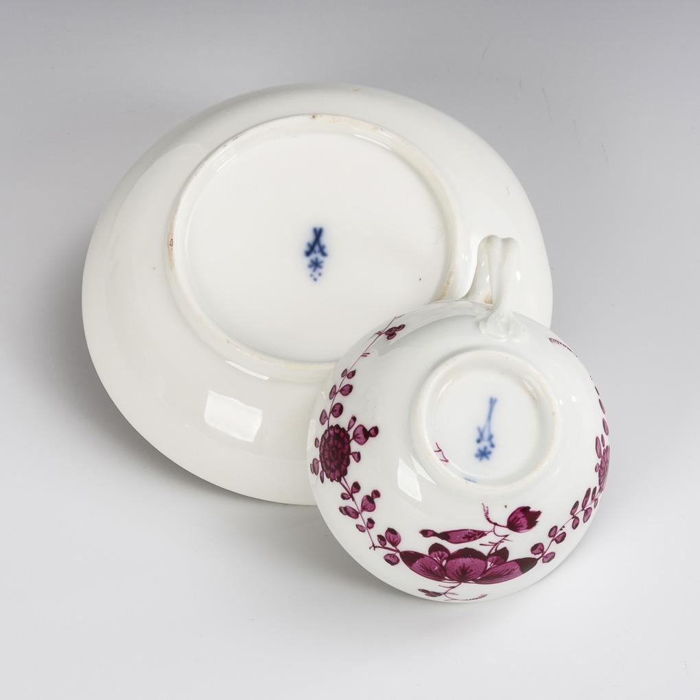 Purpurfarbene, indianische Blumenmalerei. H Tasse 4,5 cm, Ø originale Untertasse 13,5 cm.