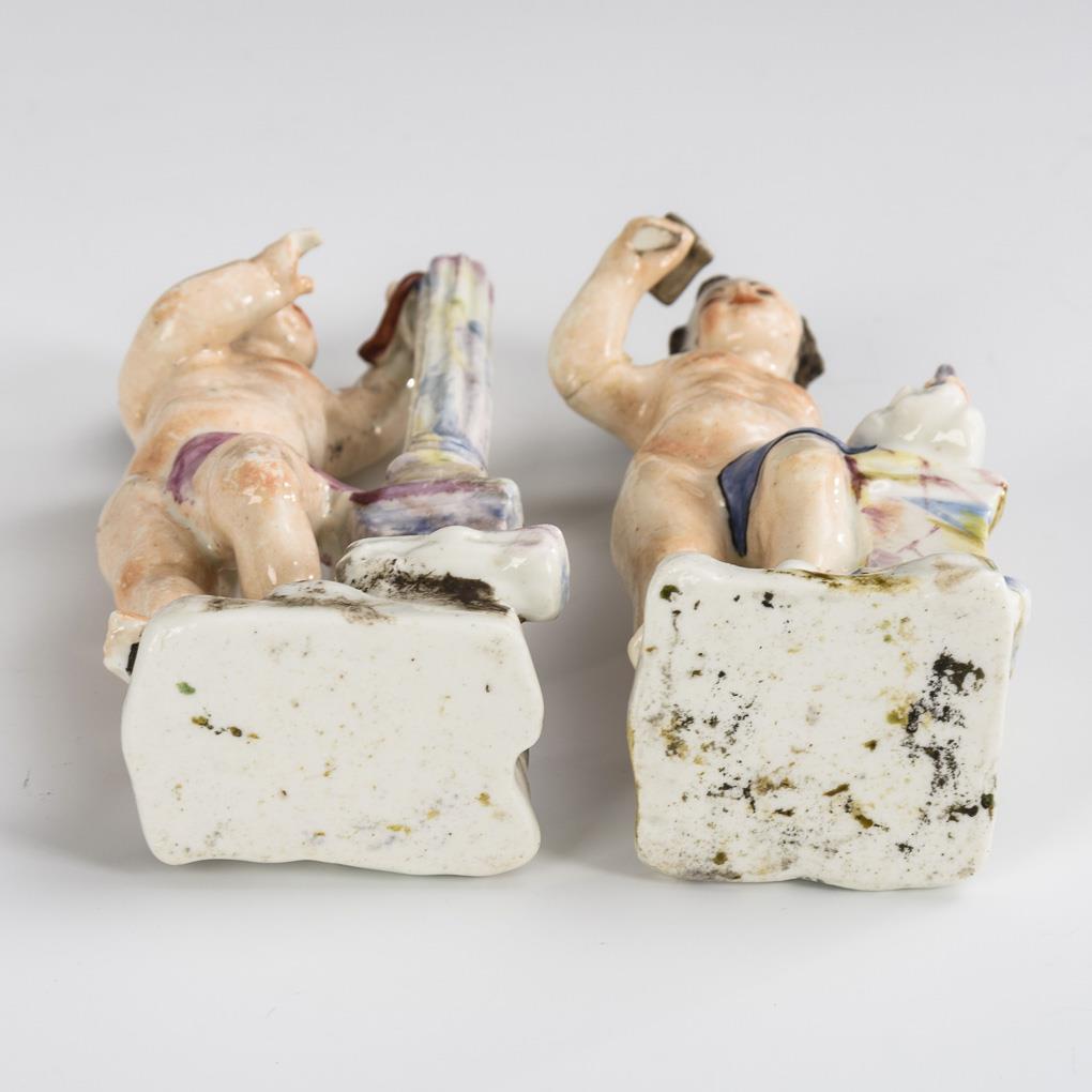 1x an einem Postament mit Büste stehender Putto mit Hammer und Meisel. /1x an einer Säule stehender Putto mit Werkzeug und einem Kapitell zu seinen Füßen. Meisel und Hammerstiel bestoßen, 1x rechter Arm geklebt.